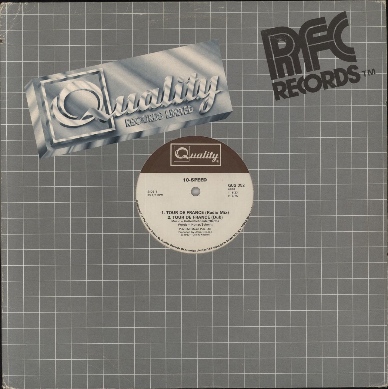 10-SPEED Tour De France (1983 US/Canadian 4-track 12" vinyl single, great cover of the Kraftwerk classic, including Radio Mix, Dub and Instrumental, die-cut company sleeve. The vinyl remains in excellent condition QUS052)