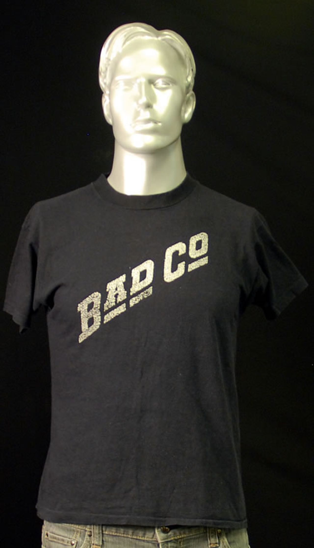 BAD COMPANY Bad Co (Vintage circa 1975 UK large sized black cotton, short sleeved t-shirt, with 'Bad Co' across the front replicating the debut album artwork. This has been worn and loved, like a lot of printed t-shirts from the 70s the print across the front has started to disapear, the fact that there is actually some still there is actually amazing)