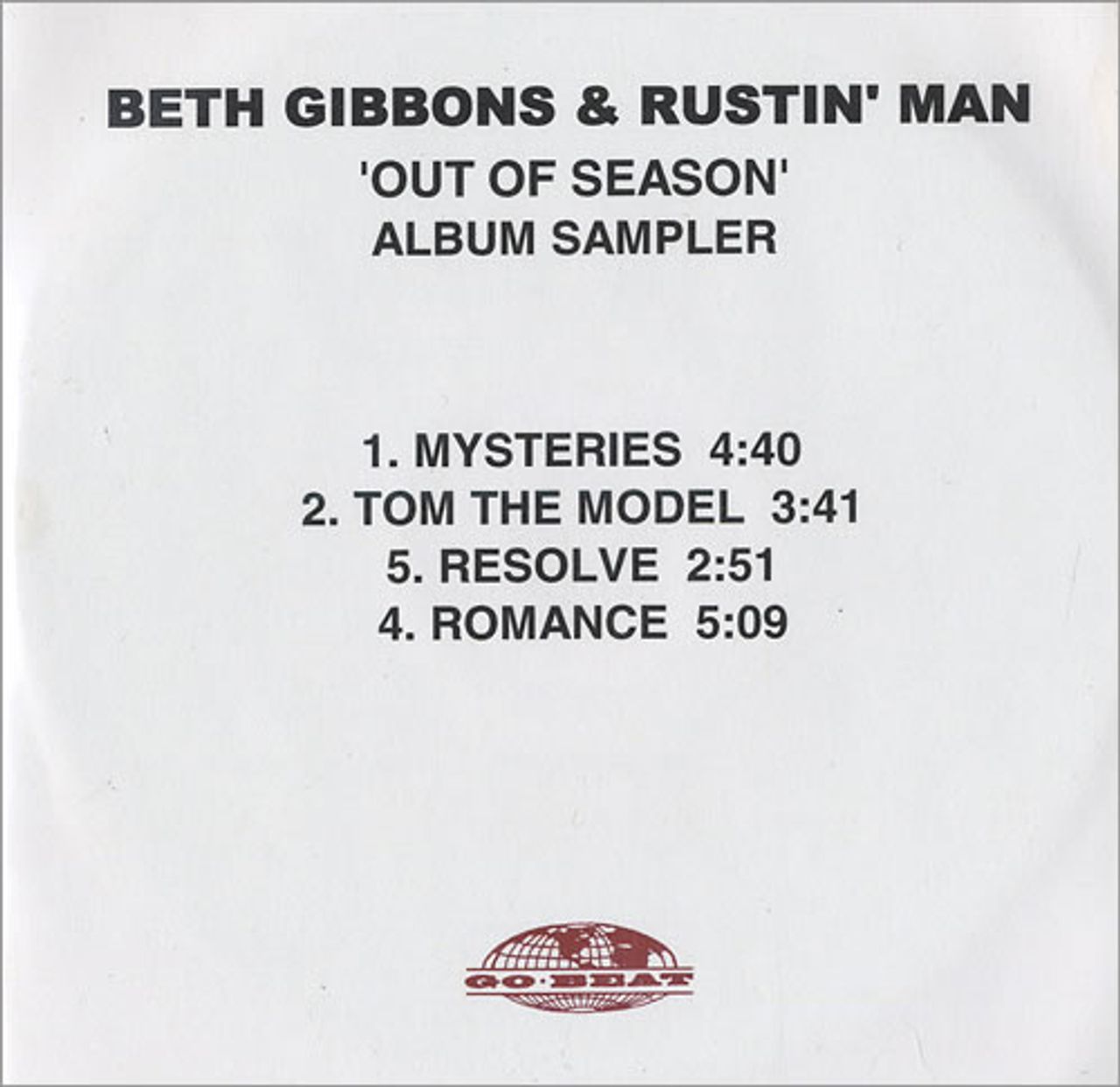 BETH GIBBONS Out Of Season - Album Sampler (2002 UK 4-track promotional CD-R acetate featuring select tracks from collaboration of the Portishead singer and the Talk Talk bassist. Includes the tracks Mysteries, Tom The Model, Resolve and Romance.Custom printed Go Beat CD-R housed in a title/tracklisting wrap around sleeve)