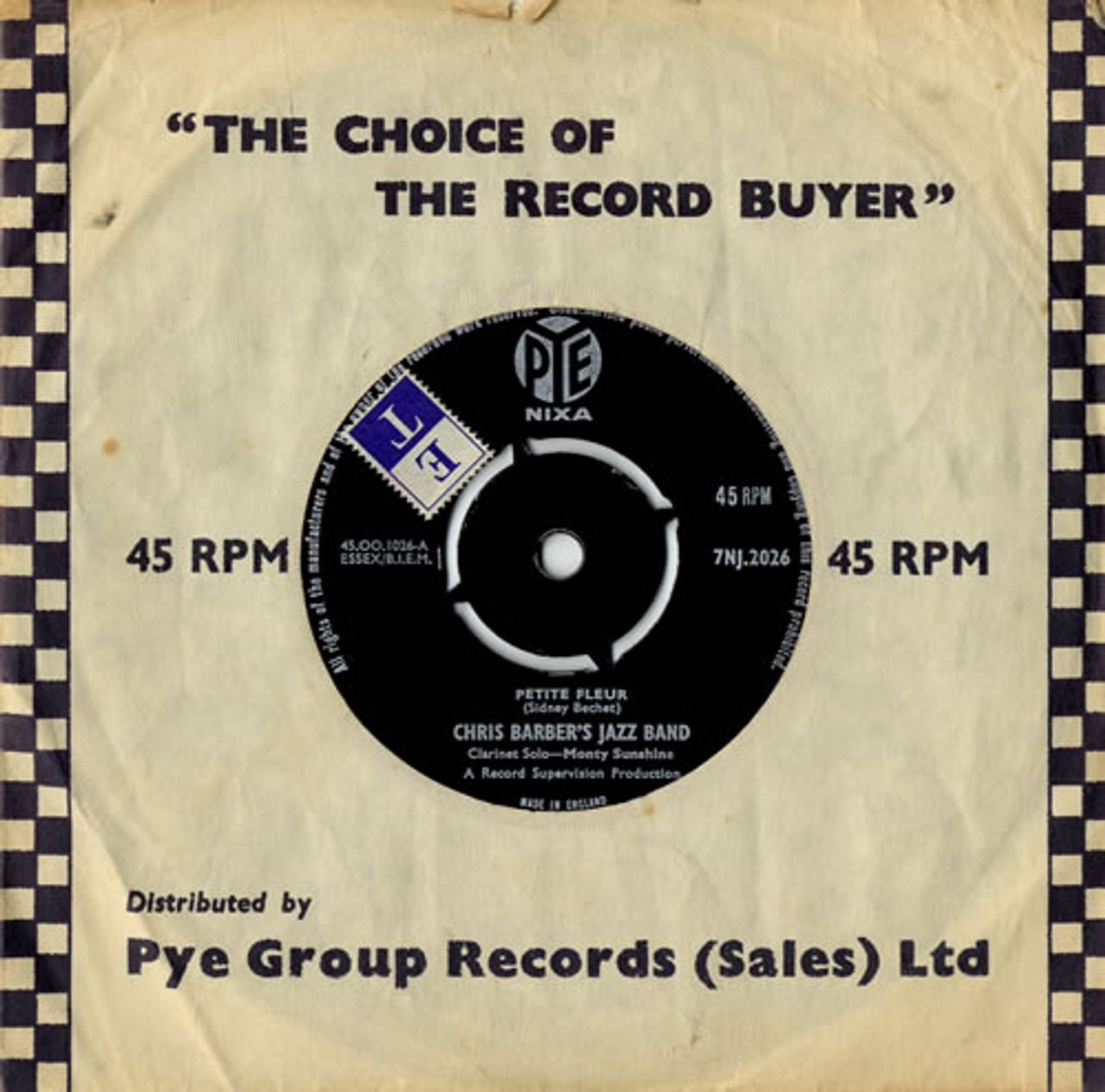 CHRIS BARBER'S JAZZ BAND Petite Fleur (1959 UK 7" vinyl single with intact four prong centre, also including Bugle Boy March, Pye company die cut paper sleeve 7NJ.2026)
