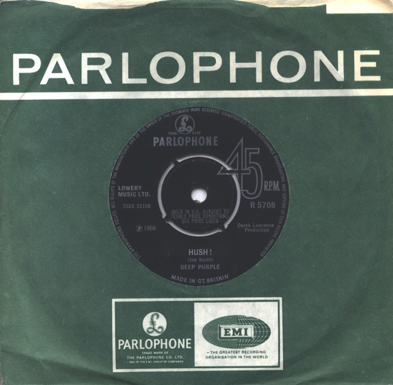 DEEP PURPLE Hush! (Rare 1968 UK 7" vinyl single with intact four prong centre, also including One More Rainy Day, Parlophone company die cut paper sleeve. The vinyl on this copy remains in excellent condition with just a few light surface scuffs to show for its forty five years R5708)