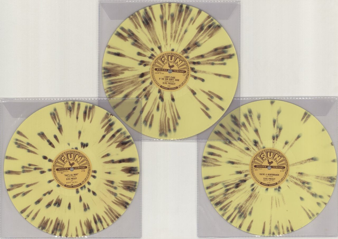 ELVIS PRESLEY 70th Anniversary Special Release (2024 US limited edition set of 10" singles pressed on 'Sun' Splatter Vinyl and plays at 78rpm. To celebrate the 70th Anniversary of Elvis' first SUN record releases, this set was pressed in an extremely low number. This is the first time an Elvis SUN replica has been produced like this and designed to play at the original 78RPM speed. Each with a replica label on each side and housed in their own PVC envelope sleeve)