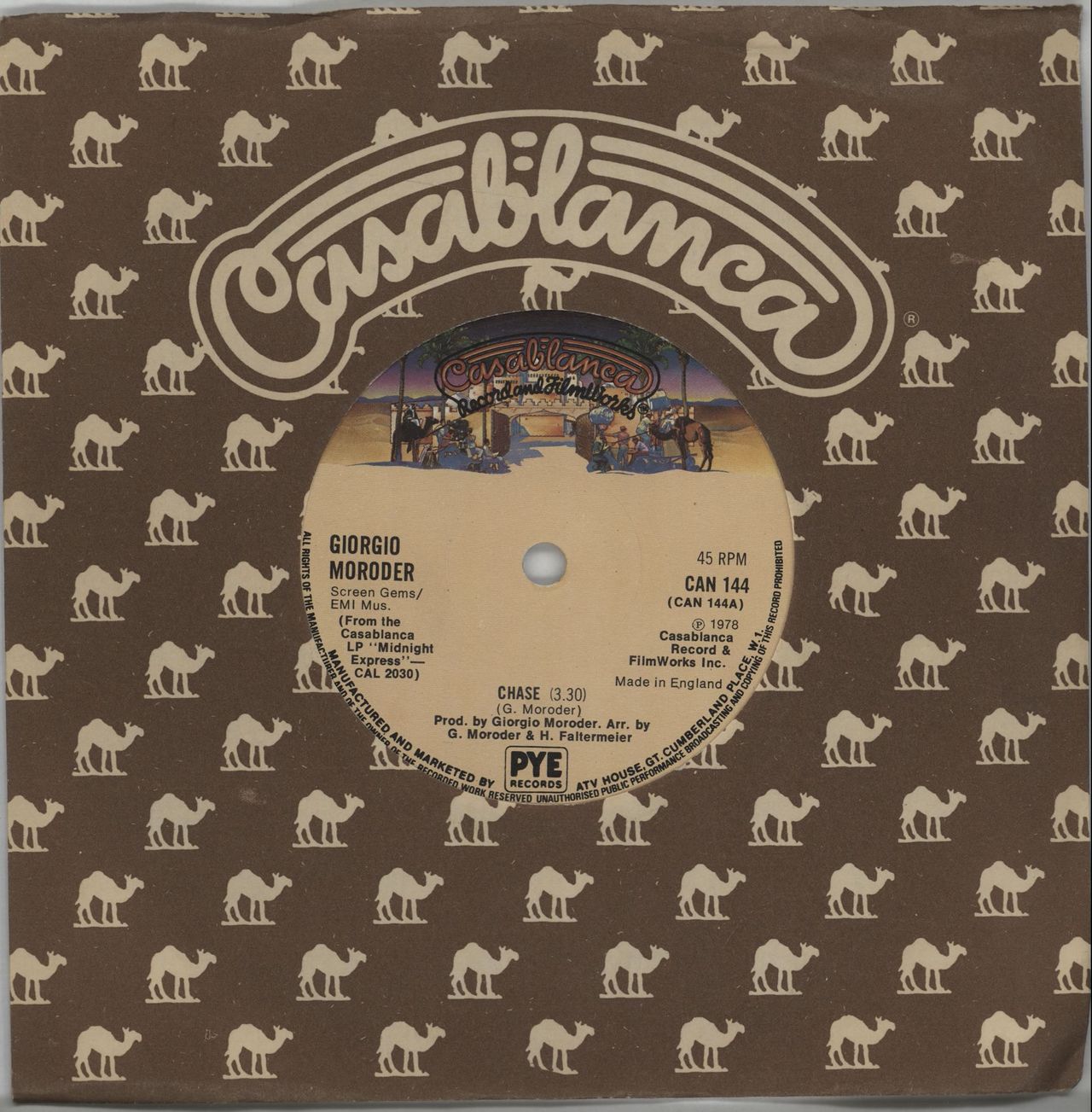 GIORGIO MORODER Chase (1978 UK solid centre 7" vinyl single, also including Love's Theme, Casablanca company die-cut paper sleeve CAN144)