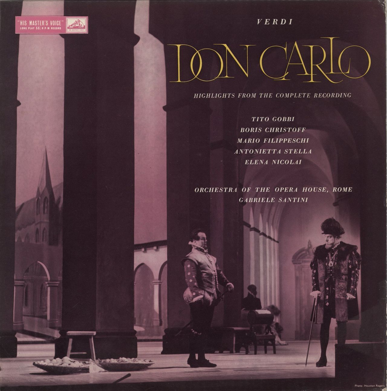 GIUSEPPE VERDI Don Carlo (Highlights From The Complete Recording) (1959 UK HMV 'Nipper' label stereo vinyl LP, performed by Tito Gobbi, Boris Christoff, Mario Filippeschi and others with the Orchestra and Chorus of the Opera House, Rome, conducted by Gabriele Santini, front laminated flipback picture sleeve with extensive liner notes. The sleeve shows minimal wear and the vinyl appears barely played ALP1700)