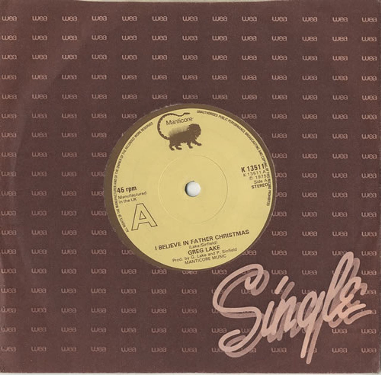 GREG LAKE I Believe In Father Christmas (Late 70s UK solid centre 7" vinyl single on the Manticore label, also featuring Humbug, WEA die-cut company sleeve K13511)