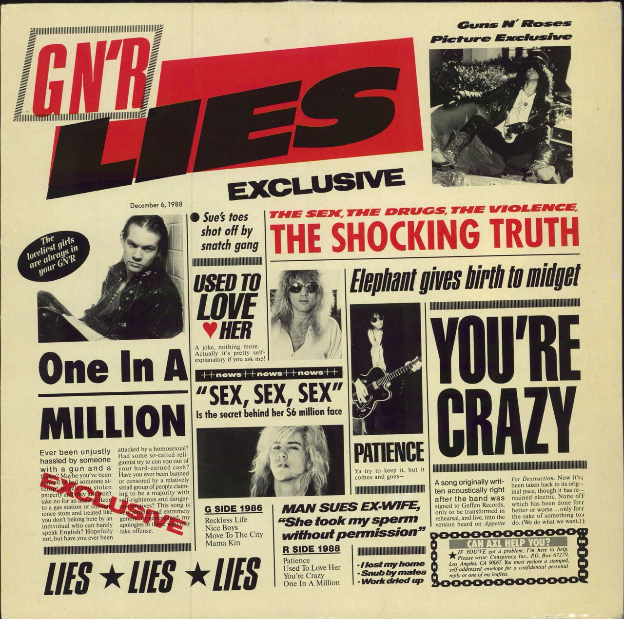 GUNS N ROSES GN'R Lies (1988 German 8-track vinyl LP, including material previously only available on the 'Live Like A Suicide' EP and 4 songs primarily written by Axl Rose on an acoustic guitar. Includes the revenge anthem I Used To Love Her,and the highly controversial One In A Million. The glossy picture sleeve displays just a little light general wear, whilst the vinyl has only light signs of play)