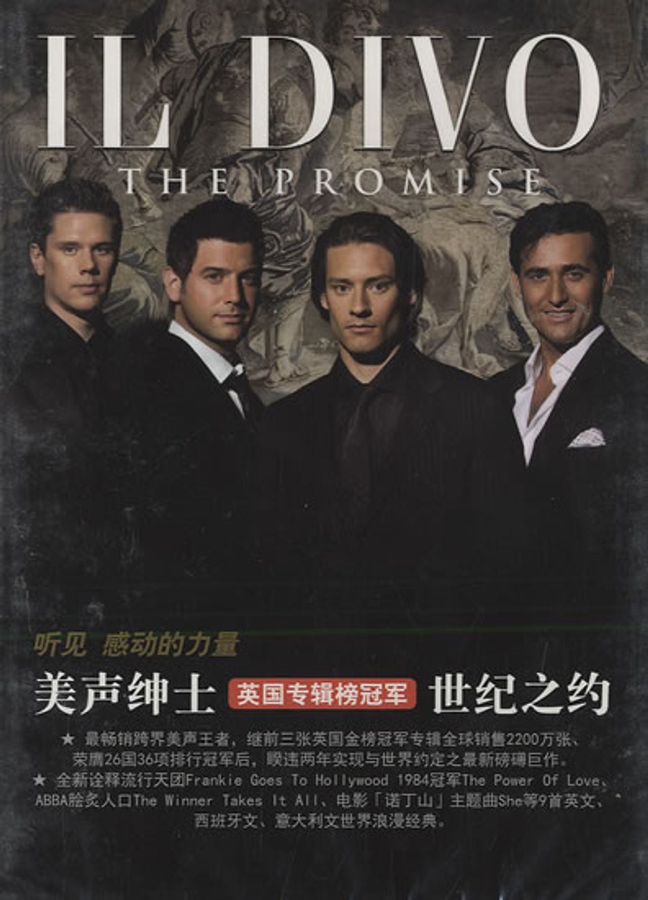 IL DIVO The Promise (2009 Chinese official Sony Music issue CD album, produced by longtime collaborator Steve Mac, revealing a courageous new direction for the group over 9 captivating songs. 'The Promise' is certainly an album of contrasts; an inspired version of Frankie Goes To Hollywood's 'The Power Of Love' features alongside a bold version of ABBA's 'The Winner Take It All' [this version excludes 'Hallelujah' and 'Amazing Grace' due to strict Chinese censorship laws], presented in unique DVD-sized case housed in sealed card slipcase with Mandarin text)