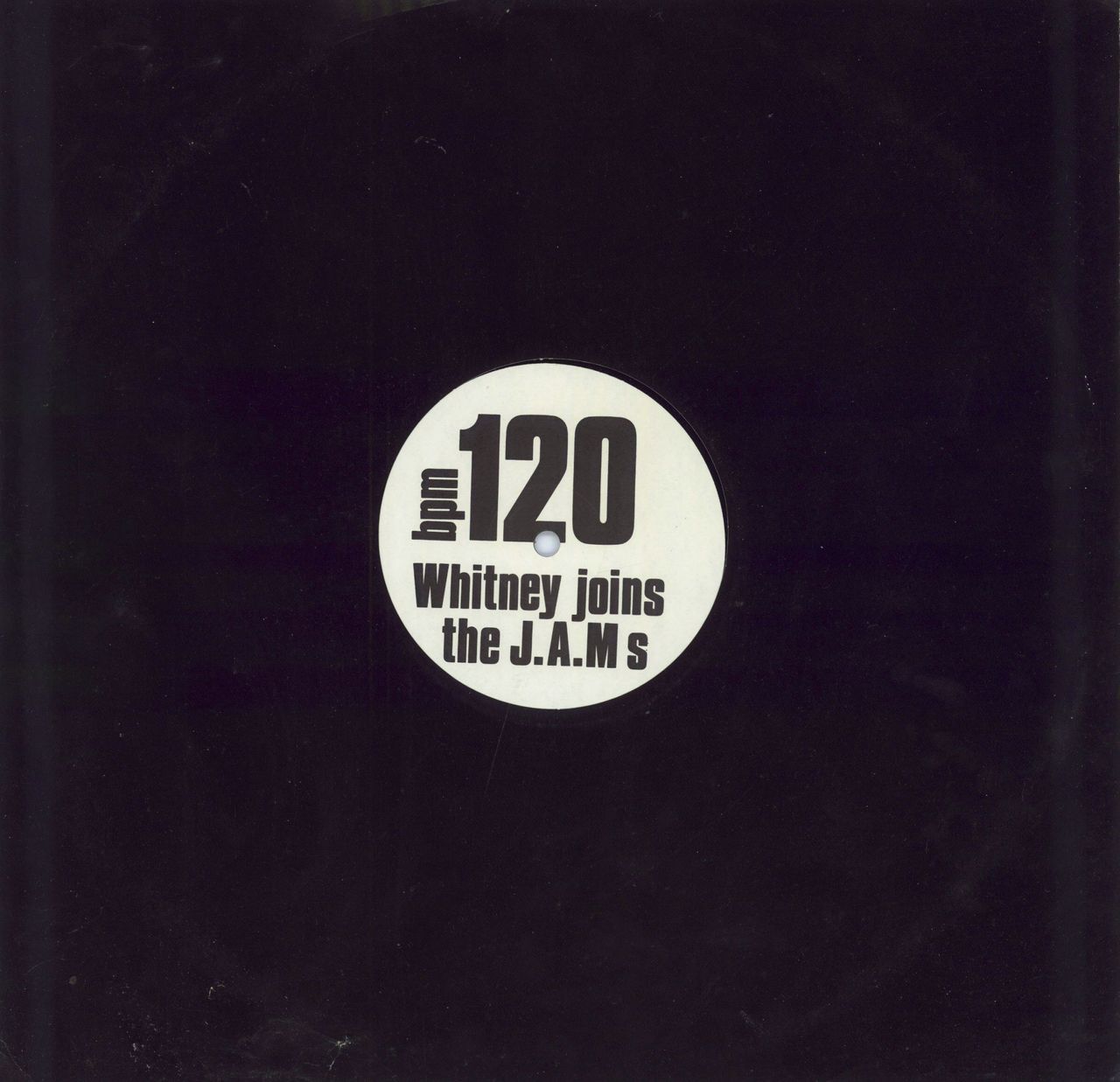 JUSTIFIED ANCIENTS OF MU MU Whitney Joins The J.A.M.S (Original 1987 UK single-sided 12" vinyl single without 'Made in Scotland' printed on the labels, comprising their 'house mash-up' built around samples of Whitney Houston, Isaac Hayes, Lalo Schifrin's Mission: Impossible theme tune and more; the labels displaying the title & '120bpm'. The vinyl has only a little light surface scuffs evident otherwise really nice JAMS24T)
