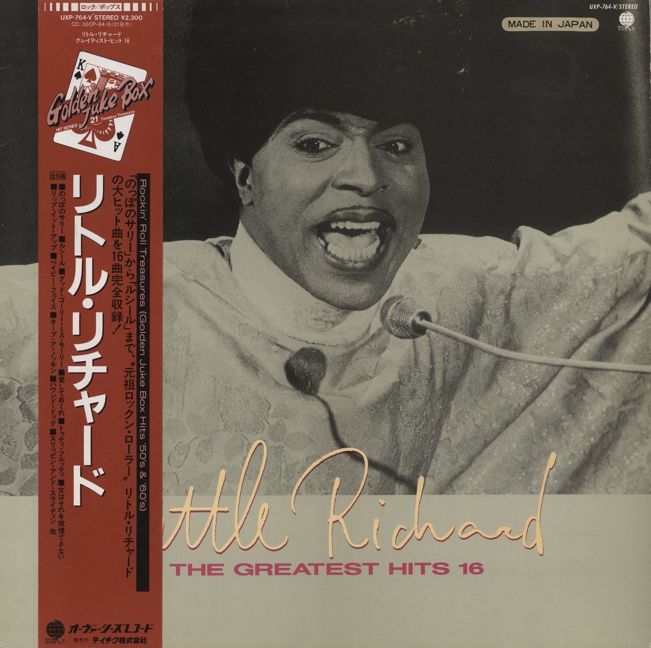 LITTLE RICHARD The Greatest Hits 16 (1980s Japanese 16-track vinyl LP compilation, picture sleeve with obi-strip and lyric insert. The sleeve shows light wear with a couple of tears to the back of the obi, whilst the vinyl appears barely played UXP-764-V)