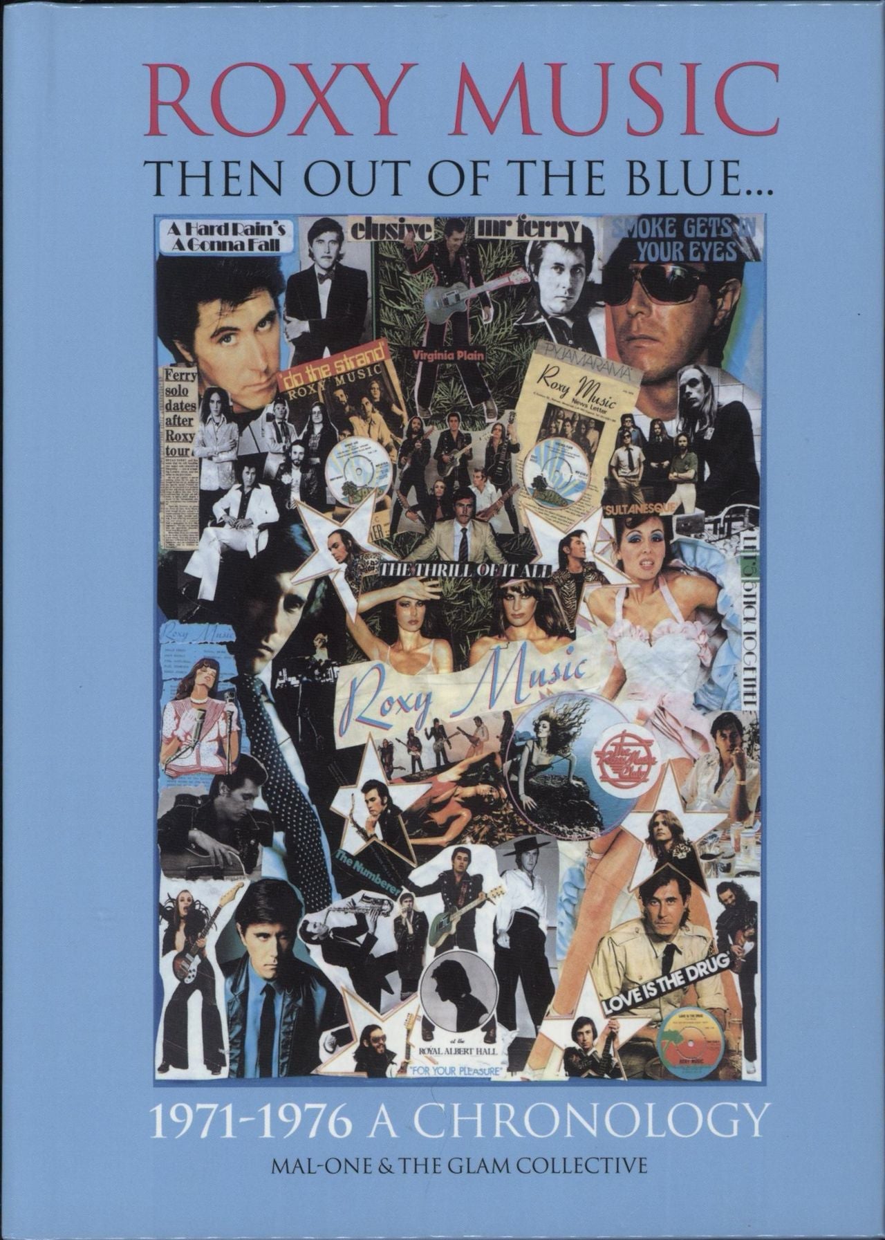MAL-ONE & THE GLAM COLLECTIVE Roxy Music - Then Out Of The Blue... 1971-1976 A Chronology (2025 UK 232-page A5 hardback book by the the London based musician/artist/author recounting the early story of one of the UK's coolest and most influential bands. Meticulously researched, it covers the groups formative years up to 1976 in chronologial date order of all the importants events relating to the band. A true Who/What/Why/Where/When? timeline for fans)