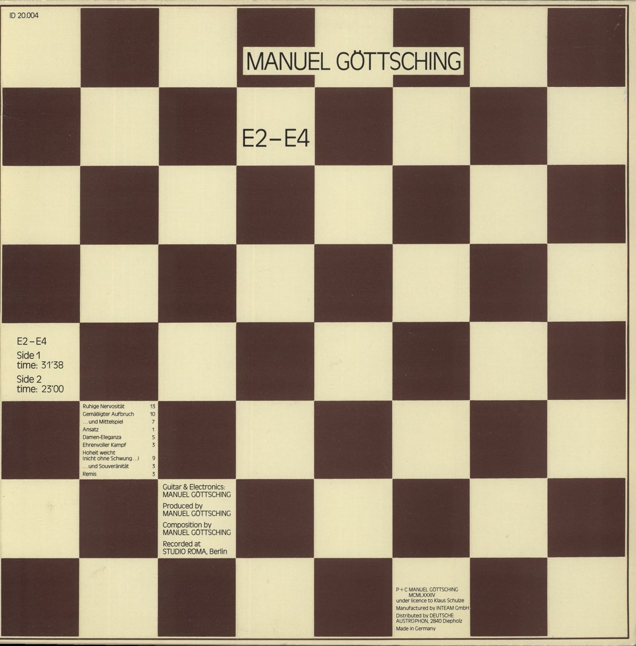 MANUEL GOTTSCHING E2-E4 (Rare 1984 German 1st press 9-track vinyl LP - A truly pioneering electronic masterpiece from the legendary Ash Ra Tempel guitarist, originally recorded in one continuous session in December 1981 and issued three yearslater to instant cult acclaim. Seamlessly blending hypnotic guitar textures with looping minimalist synth patterns, E2–E4 became one of the cornerstones of ambient and early techno, inspiring a generation of artists from The Orb to Carl Craig. Housed in the distinctive abstract artwork embossed sleeve with matching labels, this is an essential piece for collectors of German electronic and Krautrock innovation. The sleeve on this example carries mild shelfwear and the vinyl shows minimal signs of play. A superb example of forward-thinking sonic exploration that still sounds light years ahead of its time!-Highly recommended ID 20.004)