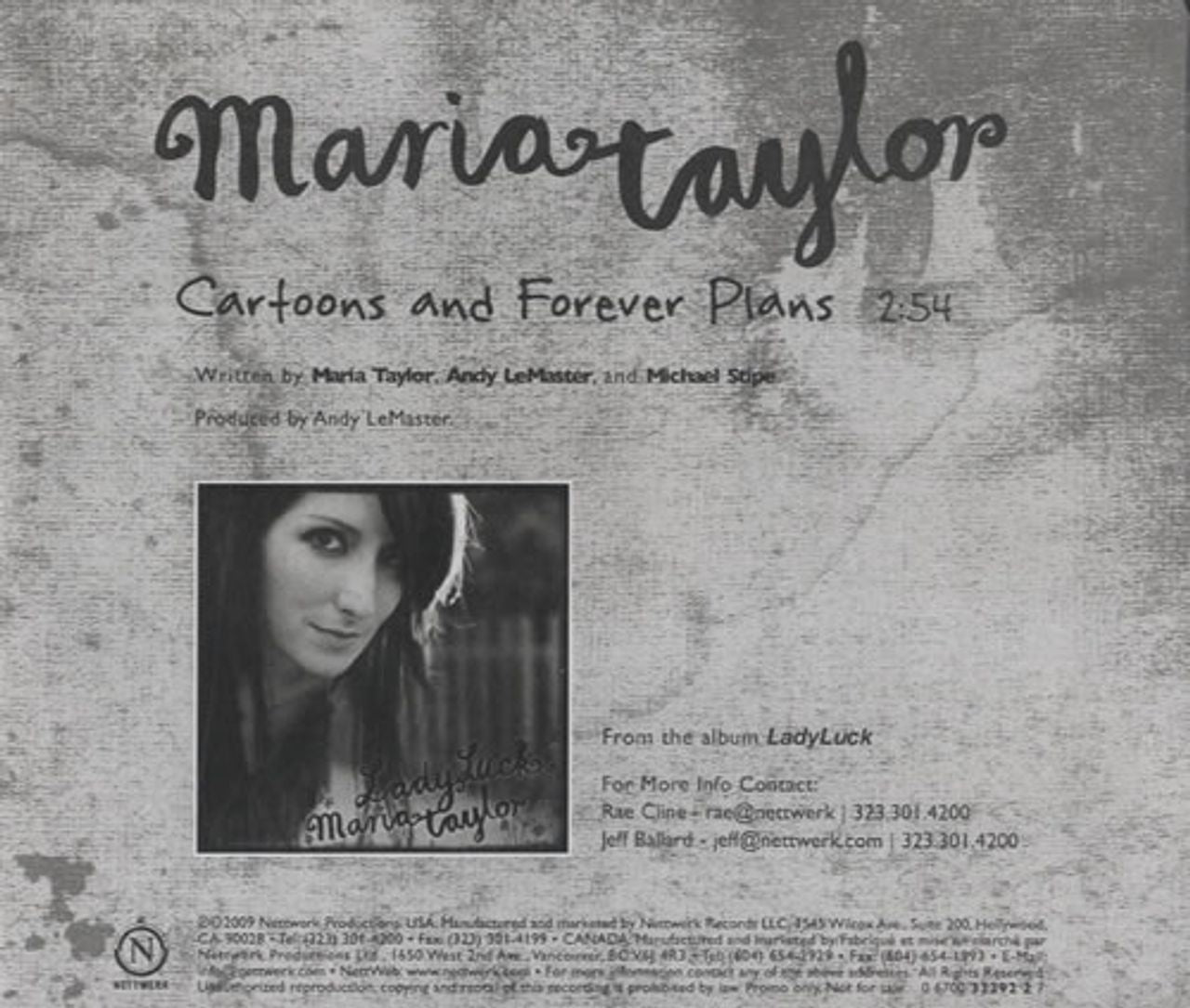 MARIA TAYLOR & MICHAEL STIPE Cartoons And Forever Plans (Official 2009 US Nettwerk label 1-track promotional only CD-R acetate for the song taken from Maria's album 'Ladyluck', this song was also co-written by Michael Stipe. Custom printed disc complete with a custom back insert and housed in a hype stickered case)