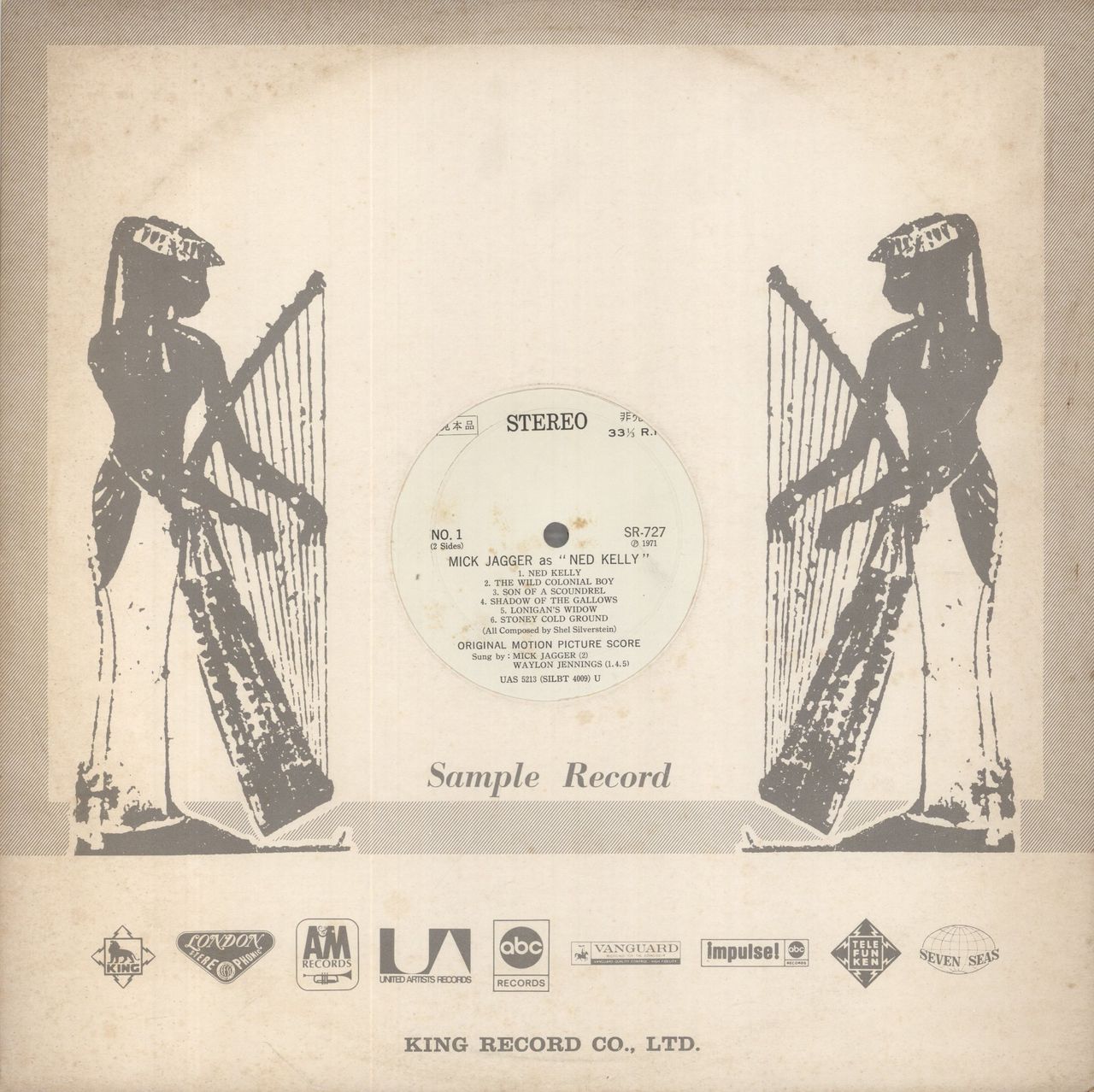 ORIGINAL SOUNDTRACK Mick Jagger As Ned Kelly (Rare 1970 Japanese promotional 11-track vinyl LP with custom 'deep groove' white labels featuring both Japanese & US catalogue numbers and 'SILBT4009' stamped into the run-out grooves, King Recordscompany die-cut sleeve. There is a split to the bottom seam of the sleeve and aside from a little foxing to the Side One label, the vinyl is Near Mint - a superb copy! SR-727)