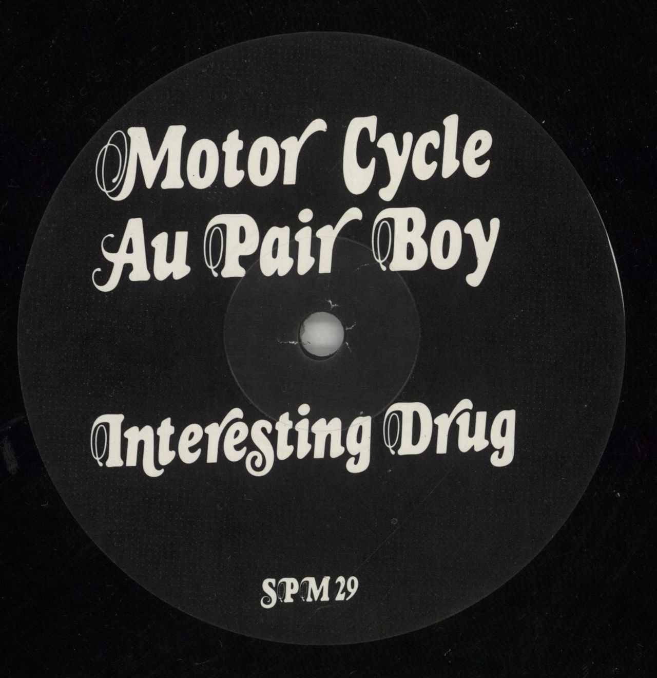 MOTOR CYCLE AU PAIR BOY Interesting Drug (UK 1-sided lazer etched anonymously titled Morrissey promotional-only 12" vinyl single, housed in a generic plain black, die-cut sleeve. The vinyl shows some very light 'cosmetic clouding' towards thebeginning of the track, with otherwise minimal signs of wear leaving it Excellent. A scarce promotional only rarity SPM29)