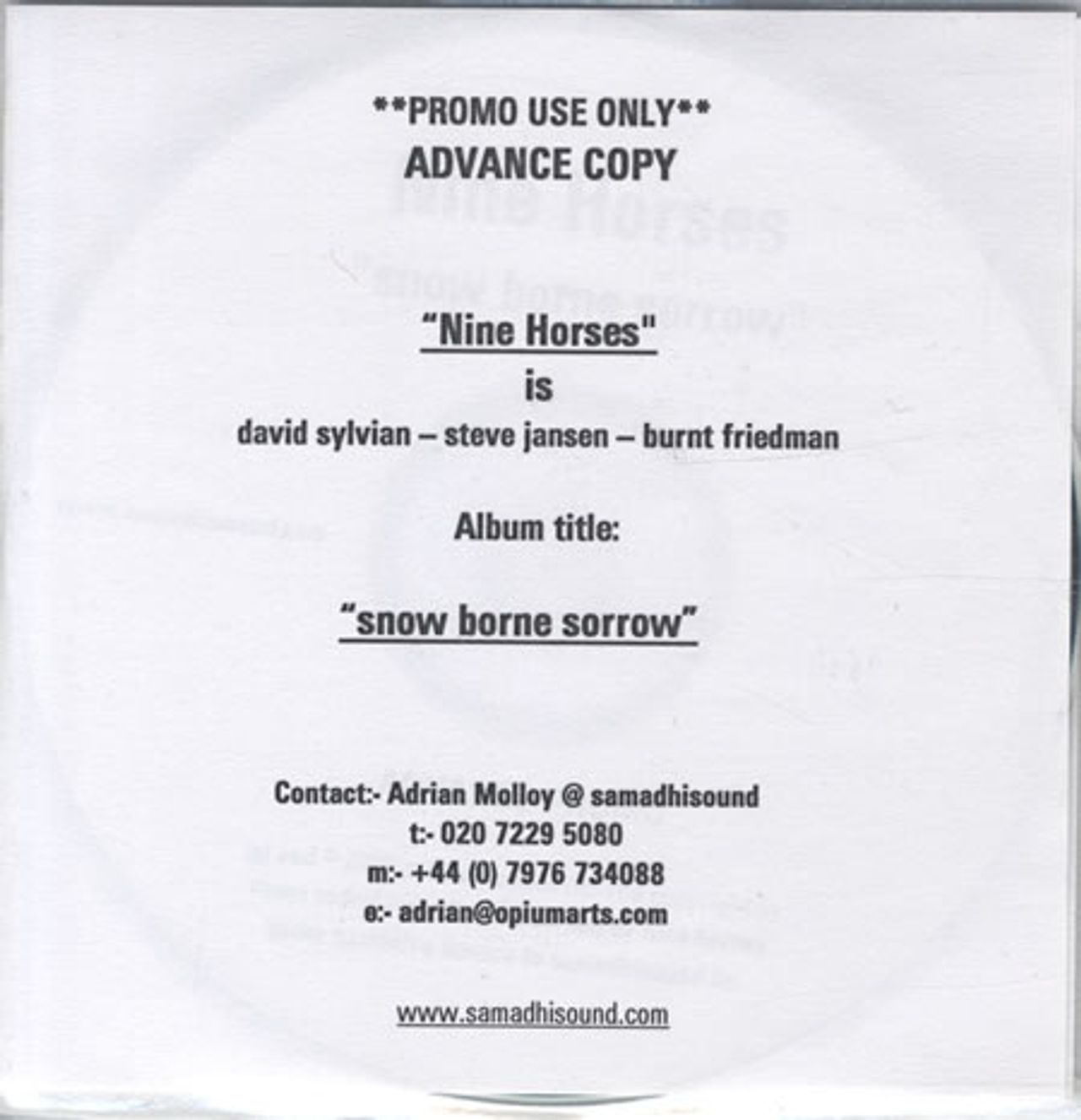 NINE HORSES Snow Borne Sorrow (2005 UK Samadhisound 9-track advance promotional CD album from this collaboration between David Sylvian, Steve Jansen and Burnt Friedman. Tracks include Wonderful World, Darkest Birds, A History Of Holes, Serotonin&The Librarian, custom printed disc, custom title/tracklisting insert)