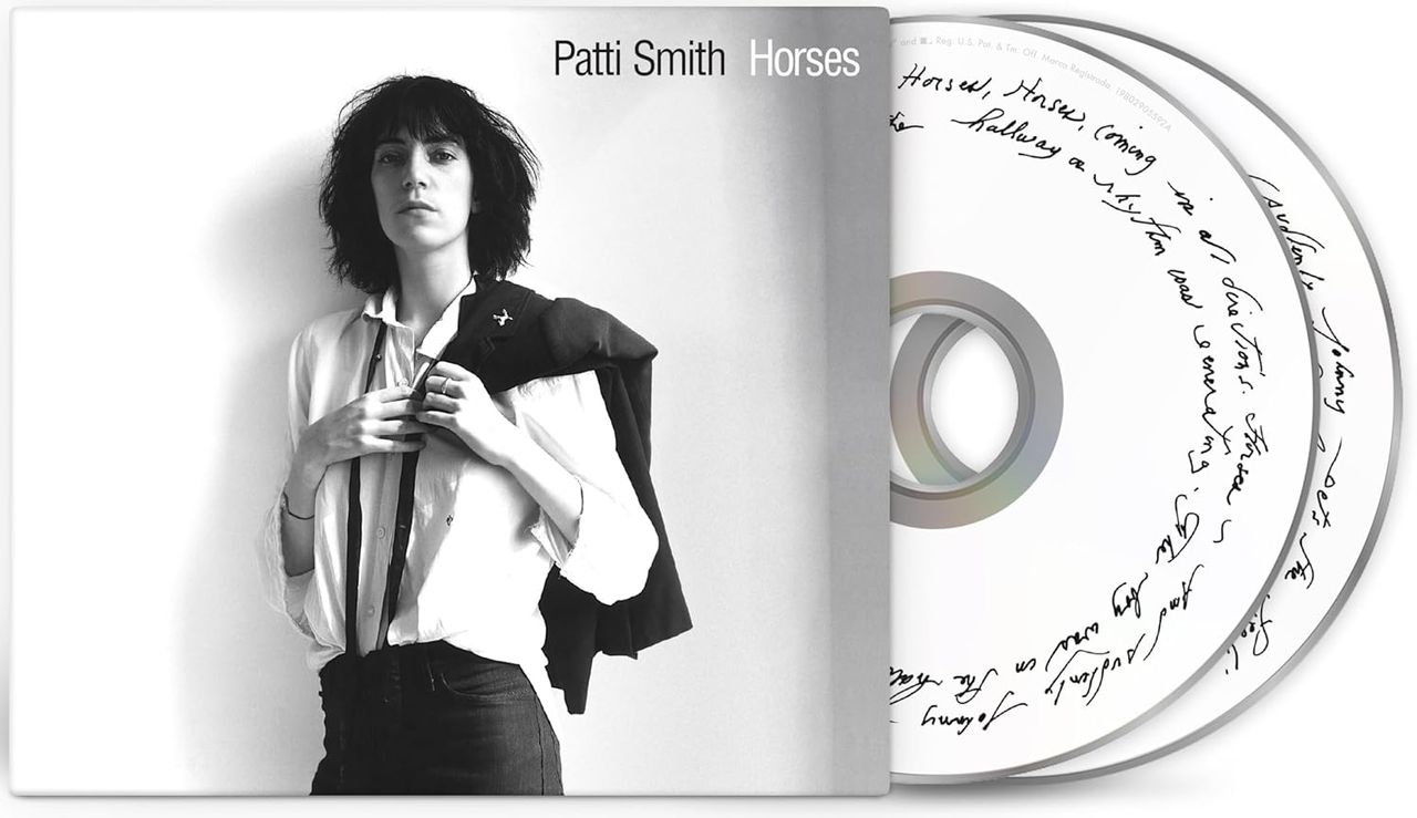PATTI SMITH Horses (2025 UK/EU 17-track double album 2-CD celebrating the 50th anniversary of one of the most influential debut albums in rock history. Horses revisits Patti Smith's 1975 masterpiece with stunning new remasters sourced directly from the original master tapes. Across two compact discs, this definitive edition presents the original album alongside a second disc of previously unreleased material, including RCA audition demos, alternate takes, and rare outtakes that illuminate the creative evolution behind Horses. The result is both a restoration and a revelation - a raw, poetic, and revolutionary work that continues to shape the language of rock. Presented in a gatefold picture sleeve with original cover artwork, hype sticker & factory sealed. Recommended)