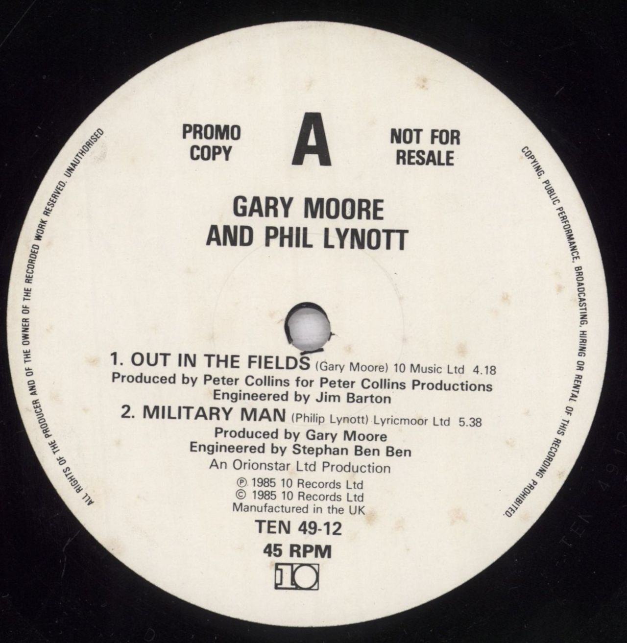 PHIL & GARY MOORE Out In The Fields (1985 UK 3-track DJ promo 12" vinyl for the single release, also featuring Military Man and Still In Love With You, plain die cut sleeve TEN49-12)