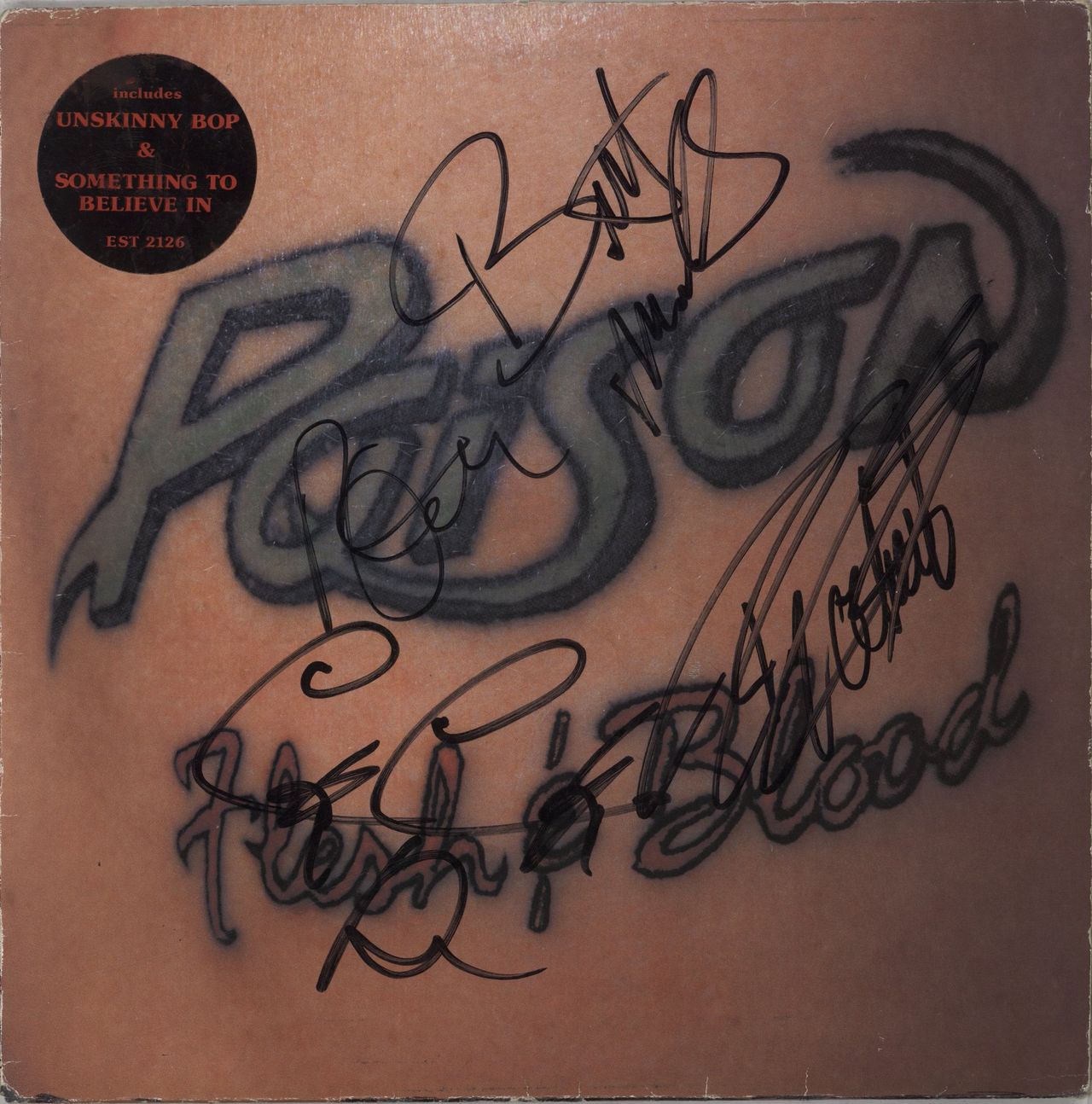 POISON Flesh & Blood (Autographed 1990 UK 14-track vinyl LP, featuring their third studio album including the singles Unskinny Bop and Something to Believe In, housed in the hype stickered glossy picture sleeve featuring the alternative 'no blood' artwork with illustrated lyric inner. The vinyl is Excellent with only faint cosmetic paper scuffs and signs of light play. The sleeve shows some edgewear but has been signed by all four members of the band - Bret Michaels, C.C. DeVille, Bobby Dall and Rikki Rockett. The signatures are in black marker pen and are still clear and legible. EST2126)