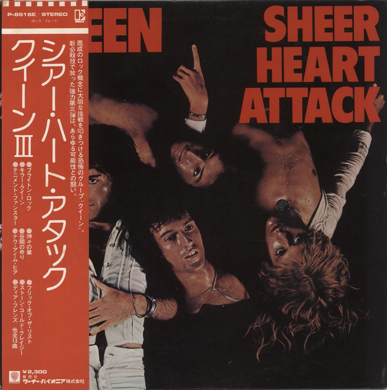 QUEEN Sheer Heart Attack (Original 1974 Japanese 13-track vinyl LP on the Elektra 'butterfly' label, featuring the brilliant Brighton Rock and their first real big hit Killer Queen, housed in the back-pasted picture sleeve including fold out illustrated lyric insert, Japanese text biography / picture insert and discography obi-strip. The sleeve displays some light general wear, the obi has some light foxing on the back otherwise light age wear, and the vinyl has minimal signs of play. This example also includes the extremely rare and unused promo calander cards, which has been folded in half but has little age wear, stunning! P-8516E)