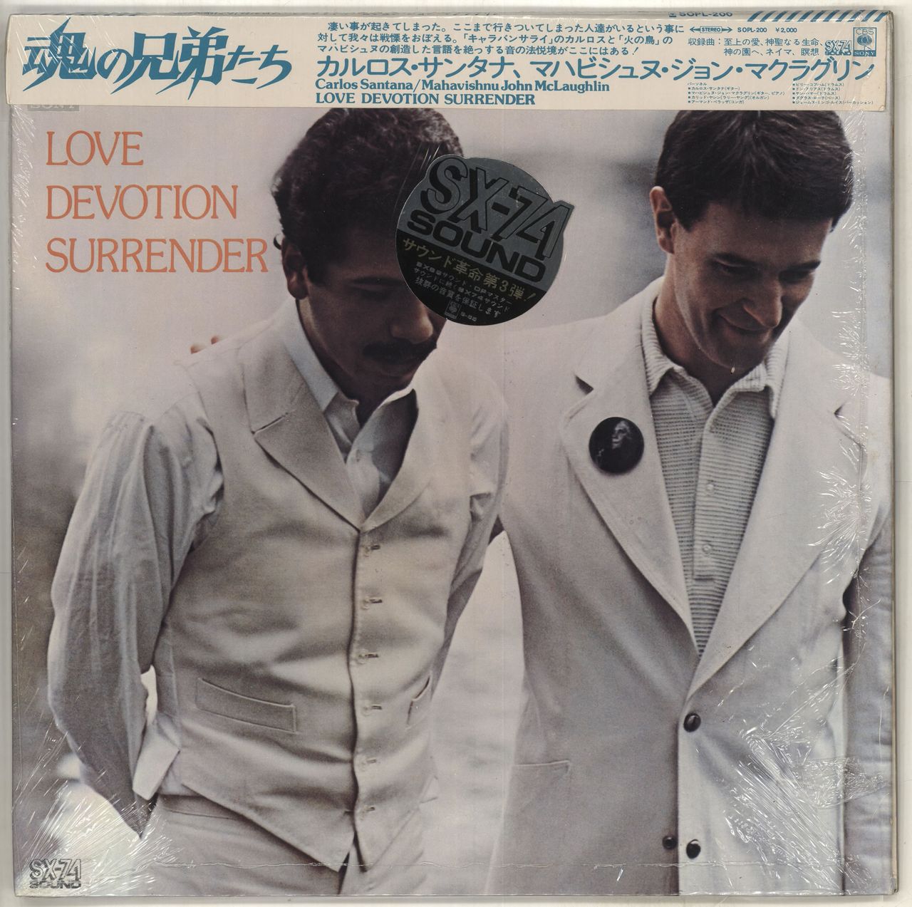 CARLOS SANTANA & MAHAVISHNU JOHN McLAUGHLIN Love Devotion Surrender (1973 Japanese 5-track 'SX74 Sound' audiophile pressed vinyl LP, complete with Japanese insert, still in open shrink wrap gatefold picture sleeve, top obi-strip and SX74 hypesticker. The sleeve shows very little signs of wear at all and the vinyl is superb SOPL-200)