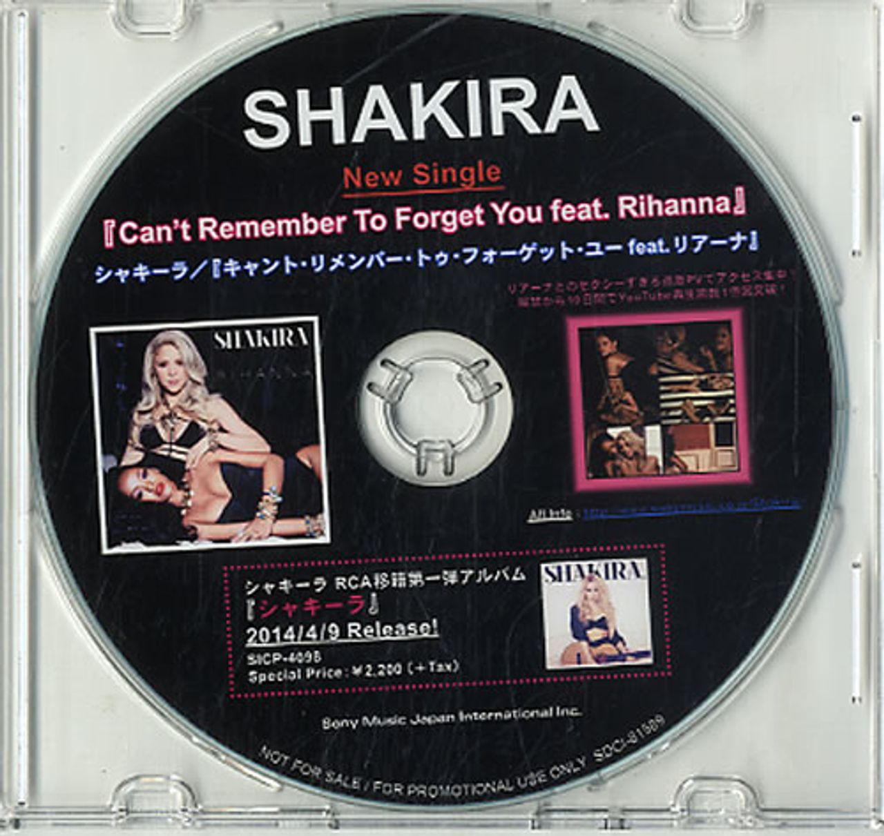 SHAKIRA Featuring RIHANNA Can't Remember To Forget You (Official 2014 Japanese Sony label 1-track promotional only CD-R, for the single taken from her selftitled album. Custom printed disc with track & release details and mini artwork images)