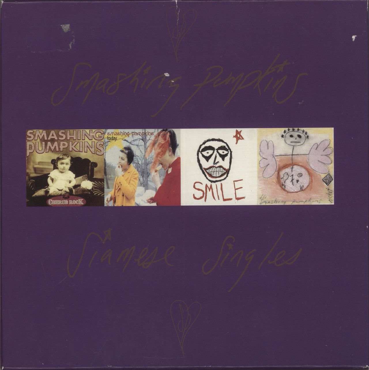 SMASHING PUMPKINS Siamese Singles (Rare 1994 UK limited edition Four 7" single box set with each pressed on Black Vinyl, including Cherub Rock, Today, Disarm & Rocket, with each in their own respective picture sleeve and all housed within a 7" x 7" purple & gold picture box. The box has some light edge scuffing to the sides and front, whilst the contents are complete and in superb condition showing very little signs of play. While not mint, a superb Smashing Pumpkins collectors item SPBOX1)