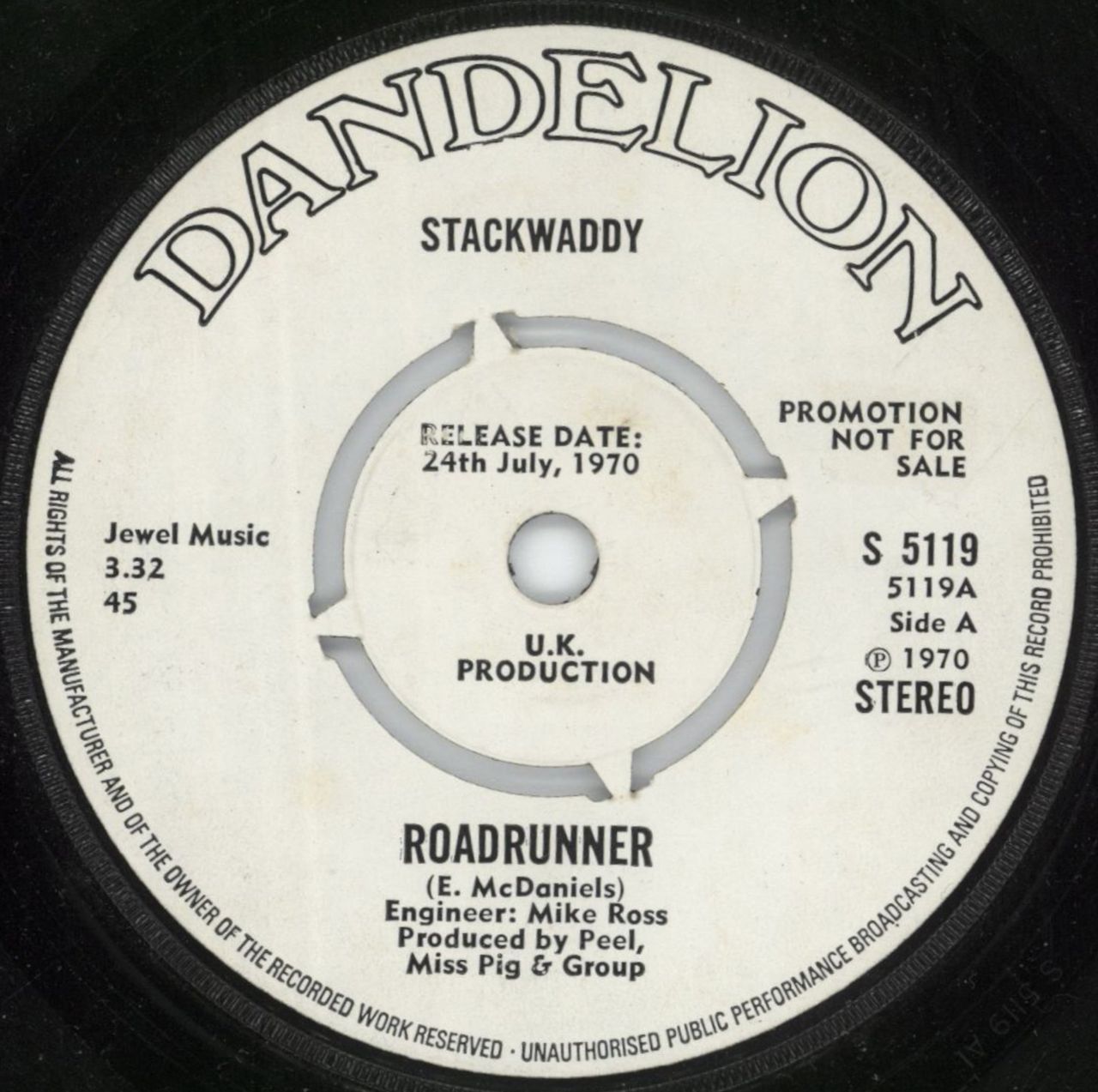 STACK WADDY Roadrunner (Scarce 1970 UK 4-prong centre promotional 7" vinyl single from the raw and raucous Space Rock outfit signed to John Peel’s legendary and short-lived Dandelion label. A gritty, no-holds-barred cover of the Bo Diddley classic, this cult favourite comes housed in a plain die-cut paper sleeve. The vinyl remains in Excellent condition despite being over 45 years old – a rare gem for collectors and fans of proto-punk and underground rock alike.)