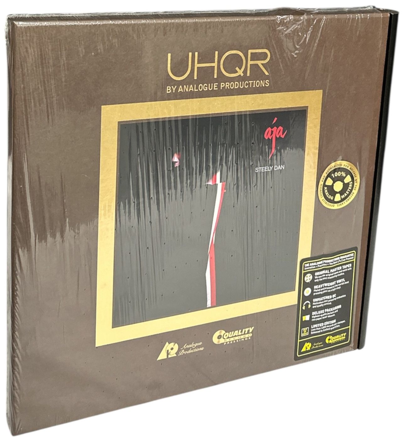 STEELY DAN Aja (2023 US UHQR limited edition 2×12" 45 RPM double LP on 200-gram Clarity Vinyl®, Analogue Productions – the ultimate divine-audiophile reissue of their 1977 masterpiece. Mastered from an analog, non-Dolby EQ’d tape copy by Bernie Grundman. Pressed at Quality Record Pressings. Housed in a deluxe tip-on gatefold double-pocket jacket, inside a fine textured slipcase with numbered gold-foil stamp and certificate of inspection. Limited to 30,000 numbered copies. Although not sealed, both the box and its contents remain Near Mint, still in its original open shrink. Highly recommended)