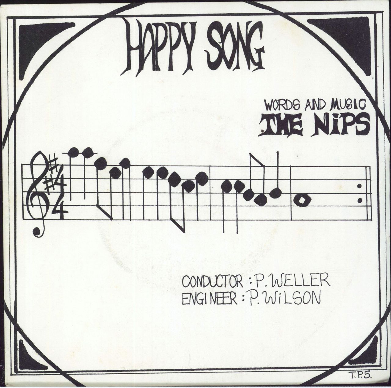 THE NIPS Happy Song (Rare 1981 UK solid centre 7" vinyl sigle on the Test Pressings label, also including Nobody To Love - both songs credit conductor as P. Weller, with engineer P. Wilson known for producing The Style Council, housed in a fragile thin card picture sleeve. Apaty from a small number 35 written on the inside, the sleeve displays minimal wear with no splits or rips, the labels are clean with no spindle marks and the vinyl remains in a 'near mint' condition.