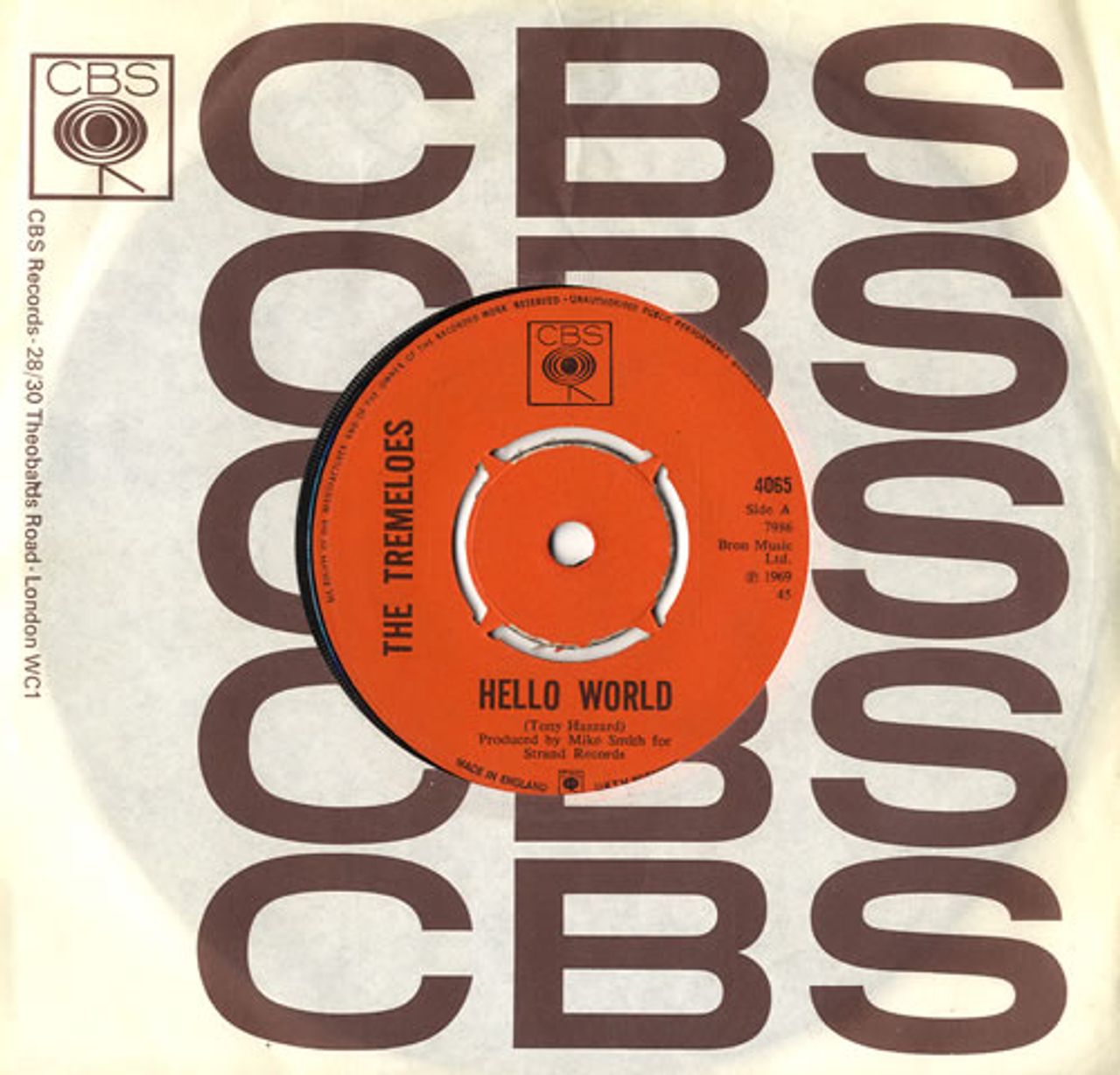 THE TREMELOES Hello World (1969 UK 7" vinyl single with intact four prong centre, also including Up Down All Around, CBS company die cut paper sleeve. Apart from some initials written on the A Side label, this copy remains in excellent condition with few signs of play)