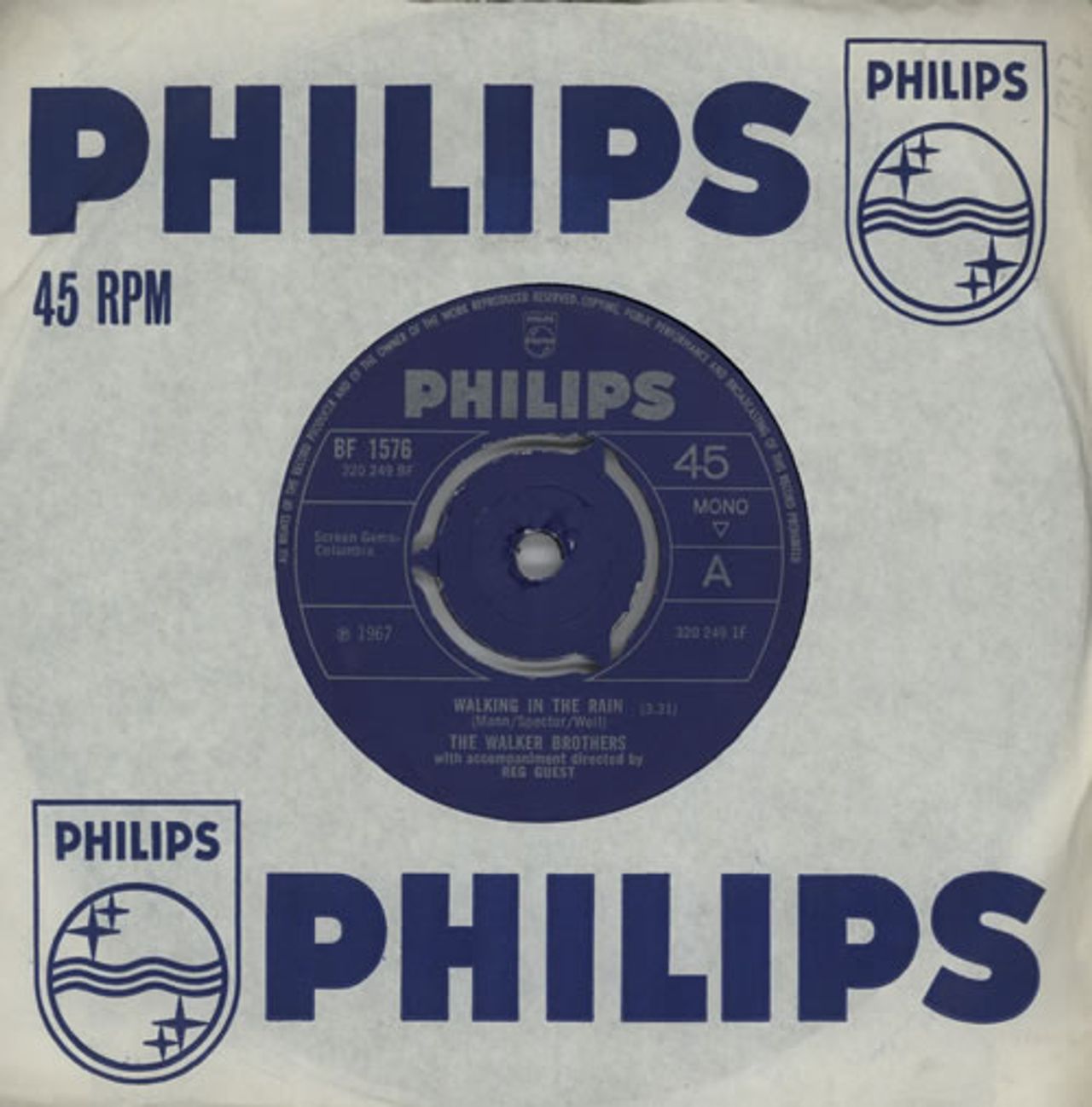WALKER BROTHERS Walking In The Rain (1967 UK 7'' vinyl single with intact three prong push-out centre, also featuring Baby Make It The Last Time, die-cut Philips company paper sleeve. The vinyl remains in excellent condition with just a coupleoflight surface scuffs and hairlines to show for its fifty odd years BF1576)