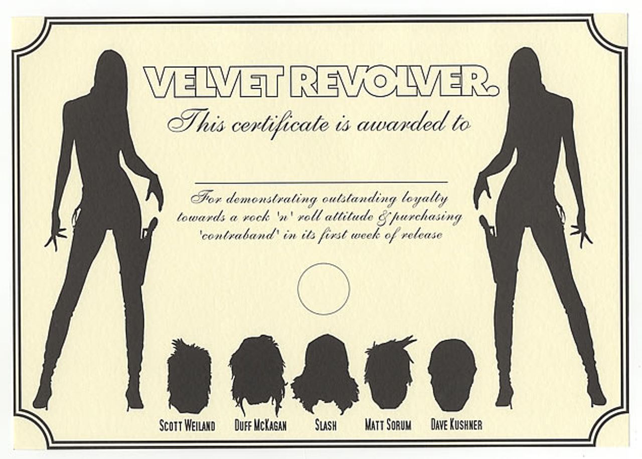VELVET REVOLVER Contraband Certificate (Rare and unused blank 'Certificate', measuring 12" x 8" and issued in limited quantities to fans with the text stating 'For demonstrating outstanding loyalty towards a rock 'n' roll attitude & purchasing 'Contraband' in its first week of release', with silhouette images of a pair of sexy ladies with holstered gun plus band member faces, complete with a promotional-only spot-lacquered colour postcard promoting the album release!)
