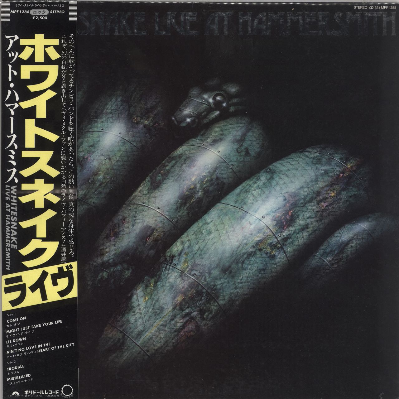WHITESNAKE Live At Hammersmith (1980 Japanese 6-track LP recorded live at London's Hammersmith Odeon on 23rd November 1978, housed in a deluxe silver embossed picture sleeve with Japanese/lyric insert & obi-strip. The sleeve is Excellent witha little edge scuffing & the vinyl is clean & in Excellent condition with barely any play MPF1288)