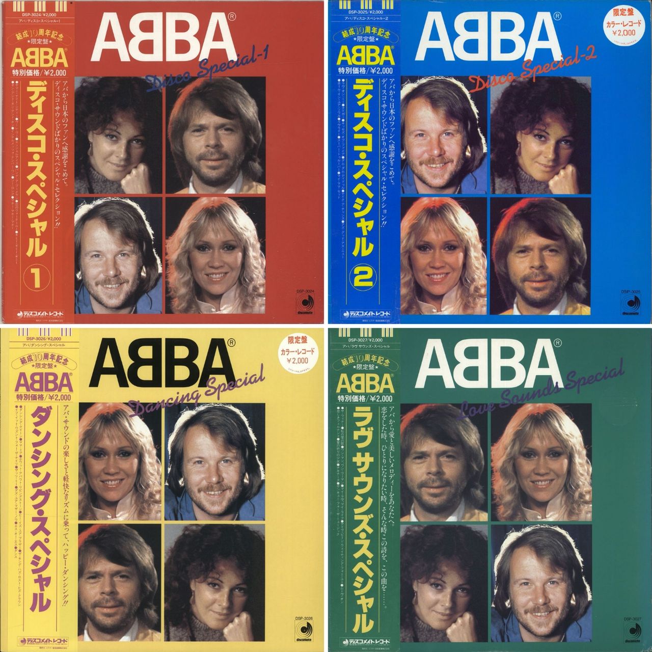 ABBA Disco Special (Fantastic 1982 Japanese 40-track set of all FOUR exclusive COLOUR VINYL LPs with picture labels, comprising the 'Disco Special 1' LP on RED VINYL, 'Disco Special 2' on BLUE VINYL, 'Dancing Special' on YELLOW & 'Love Sounds Special' on GREEN VINYL. Each collectable LP is housed in its own colour coded picture sleeve (two still have the original yen price sticker attached), each with its respective lyric insert & obi-strip . The packaging appears Excellent to Near Mint with just the occasional light patch of foxing & the vinyl discs appear Near Mint - a stunning set & very hard to find in one go! DSP-3024~7)