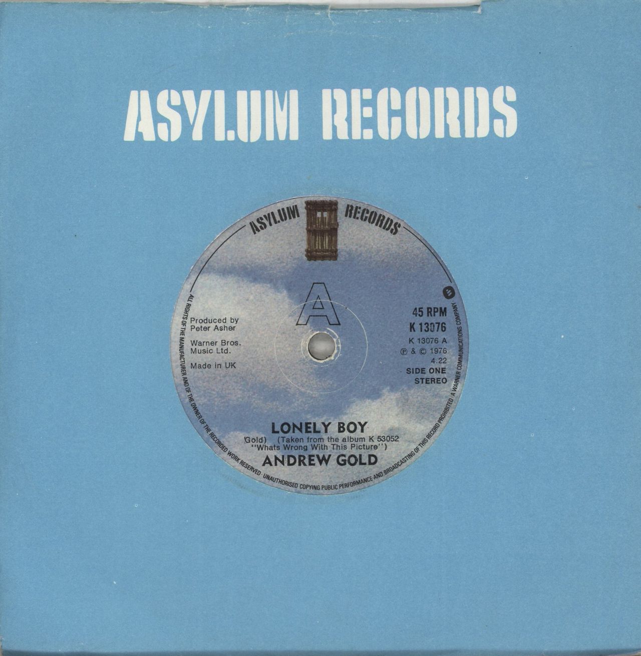 ANDREW GOLD Lonely Boy (1976 UK solid centre 7" vinyl single, also including Angel Woman. Issued in an Asylum company die-cut paper sleeve, the vinyl remains in Excellent condition K13076)
