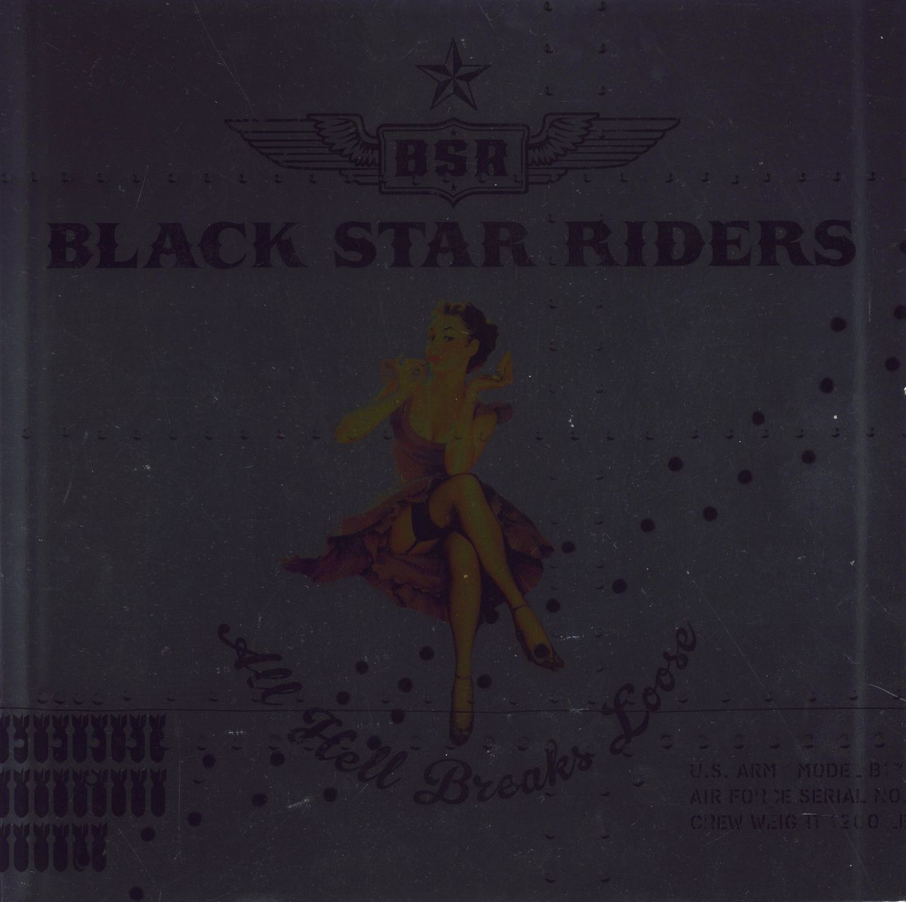 BLACK STAR RIDERS All Hell Breaks Loose (2015 issue of the 2013 German limited edition 12-track double 180gm Heavyweight Vinyl LP, the debut studio album from the Hard Rock group which evolved from the touring version of Thin Lizzy, assembled by guitarist Scott Gorham and fronted by Ricky Warwick, including the singles Bound For Glory, Hey Judas and Kingdom Of The Lost. Housed in a silver metallic gatefold picture sleeve with picture / lyric inners and limited fold-out poster. Both sleeve & vinyl remain in a 'near as new' condition NB3069-1)