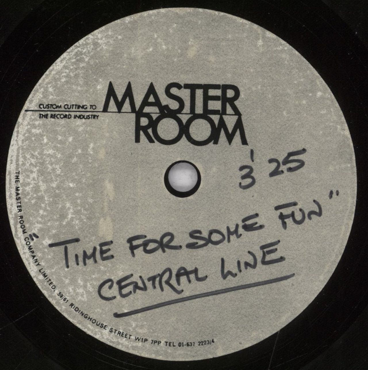 CENTRAL LINE Time For Some Fun (Rare 1983 UK single-sided 7" metal based high-grade methyl cellulose lacquer acetate for the single release [MER148], with a custom printed 'Master Room' company label with handwritten artist name & track title.Pressed in extremely small numbers for sonic reference, this rarity comes direct from the personal collection of an ex-music industry employee & remains in Excellent condition)