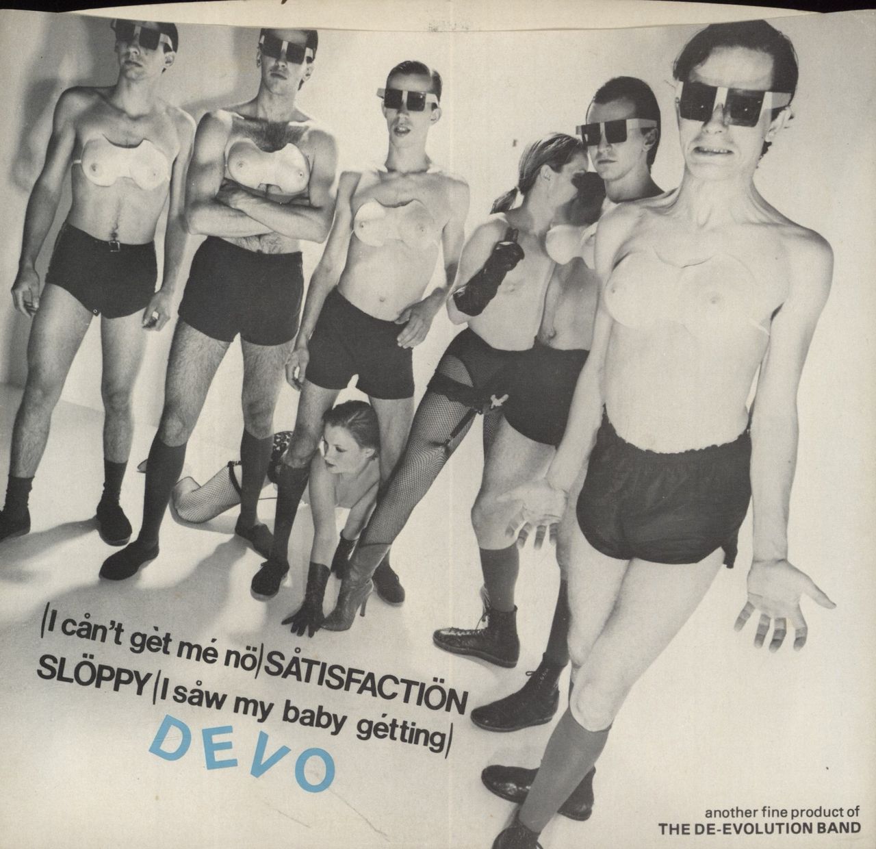 DEVO [I Can't Get Me No] Satisfaction (Rare original 1977 US Bomp 7"wide centred vinyl single also featuring Sloppy, picture sleeve which is convex cut on the front and concave cut on the back. The sleeve [VG] has a side seam split and shows alittle creasing, whilst the vinyl shows few signs of play)