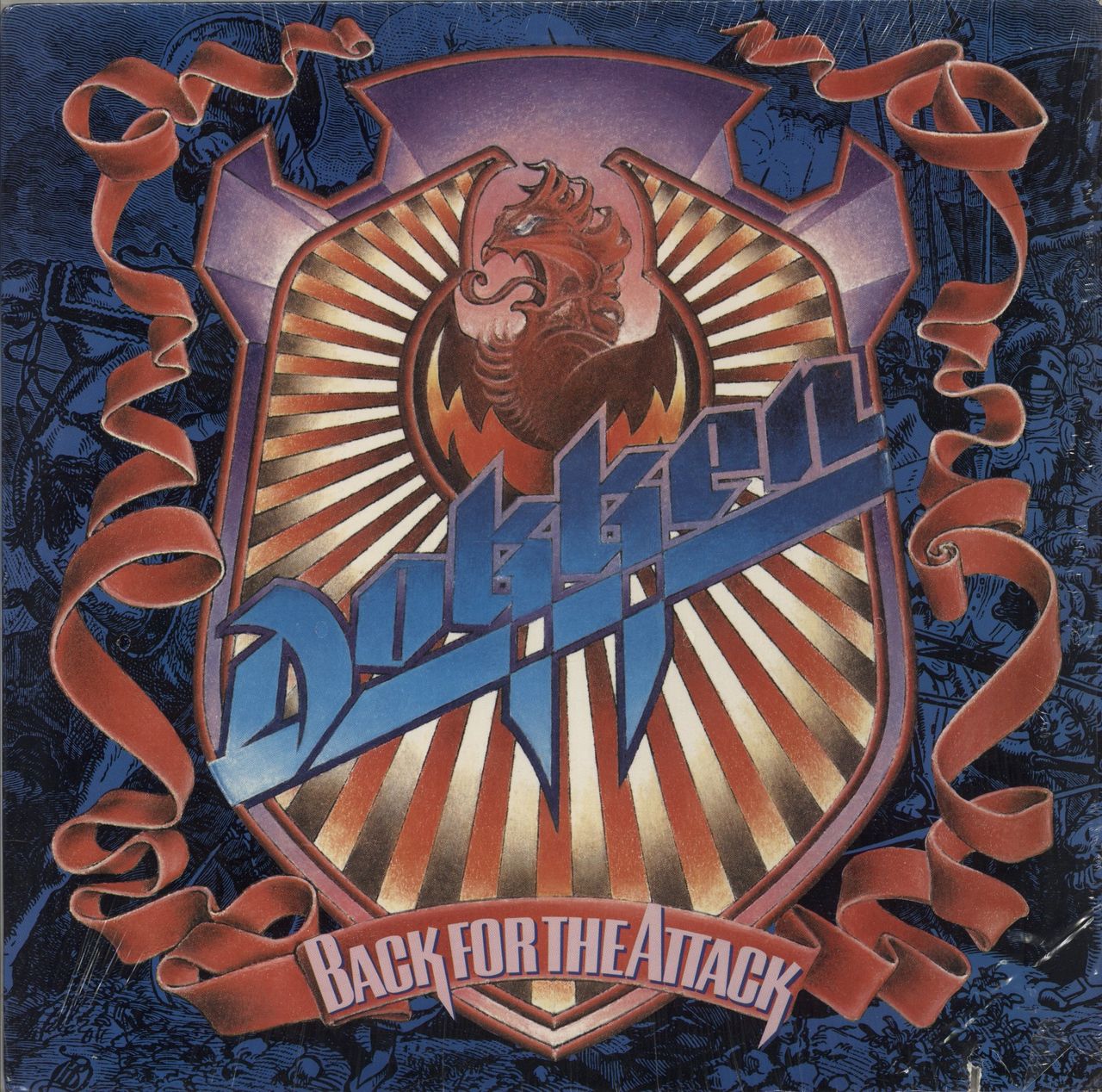 DOKKEN Back For The Attack (1987 US 15-track vinyl LP, the fourth studio album by the American heavy metal band including the single Dream Warriors, the theme song for the horror film A Nightmare on Elm Street 3:Dream Warriors; within a glossypicture sleeve with picture inner. The sleeve retains its open shrink so has minimall wear, whilst the vinyl looks barely played EKT43)