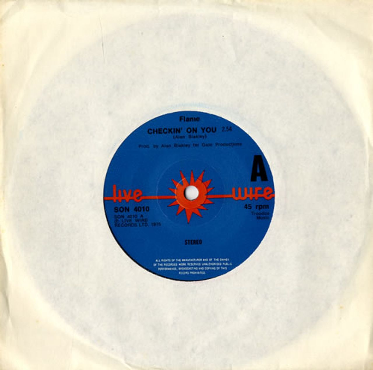 FLAME Checkin' On You (1975 UK solid centre 7" vinyl single, also including Isn't It Nice, both tracks written by Alan Blakley, plain company die cut paper sleeve SON4010)