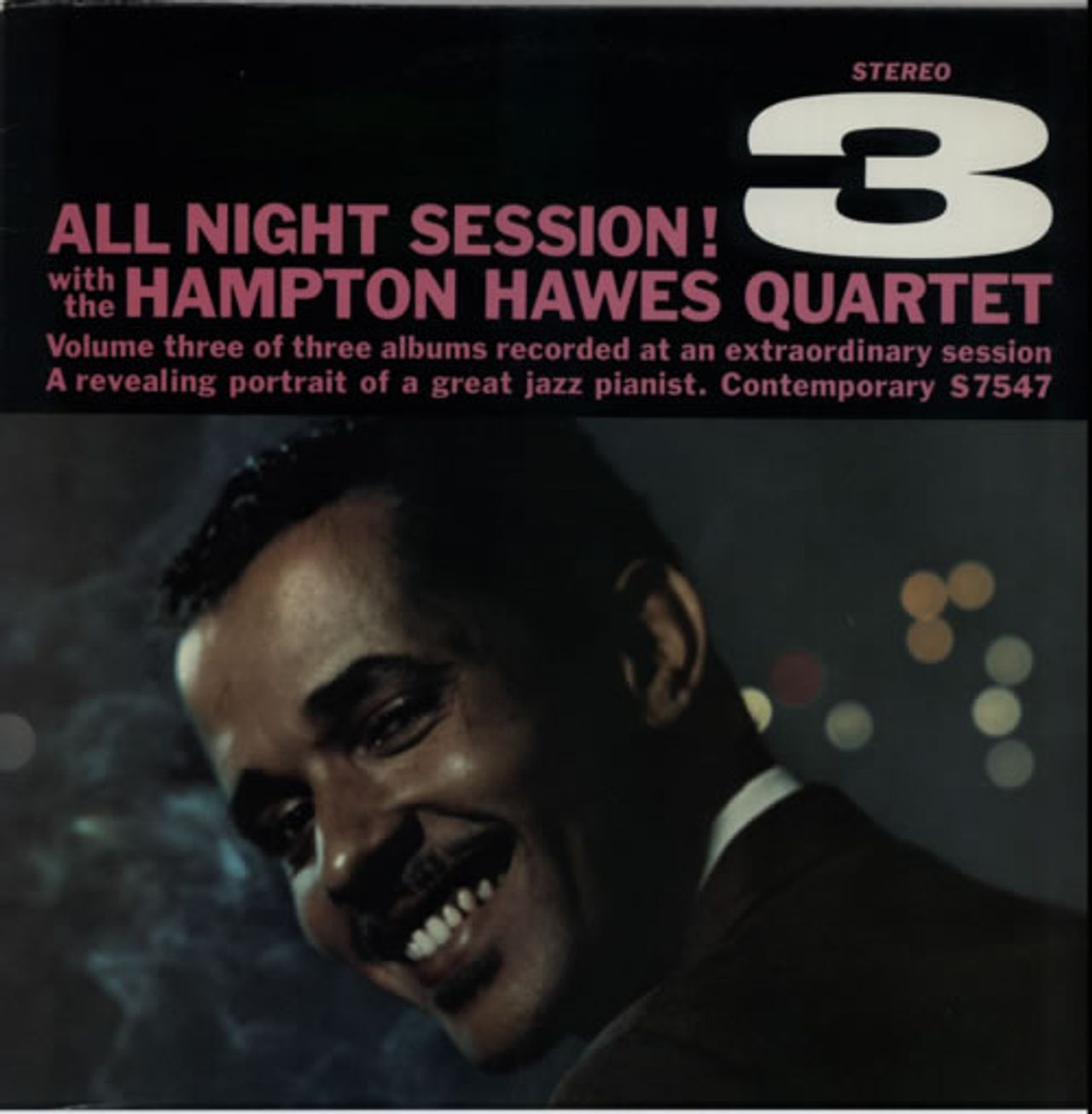 HAMPTON HAWES QUARTET All Night Session! Volume 3 (70s US issue of the 1958 4-track stereo LP, the third & final part of a portrait of the pianist, starring Jim Hall, Red Mitchell & Bruz Freeman, pasted picture sleeve. The sleeve shows only minor edgewear and the vinyl looks barely played S7547)