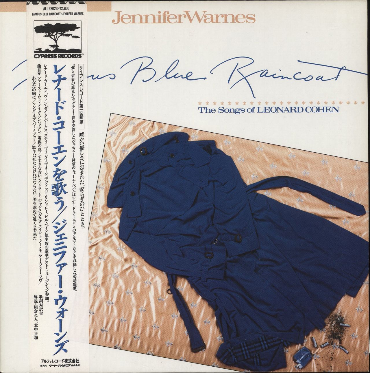 JENNIFER WARNES Famous Blue Raincoat (Scarce 1986 Japanese 9-track promo sample LP with guest appearances by Stevie Ray Vaughan, Robben Ford, David Lindley, Van Dyke Parks, and guest vocal by Leonard Cohen on Joan Of Arc featuring the songs ofLeonard Cohen & including fold out Japanese/lyric insert, picture sleeve & obi-strip. The sleeve shows only minimal wear and the disc is Near Mint ALI-28023)