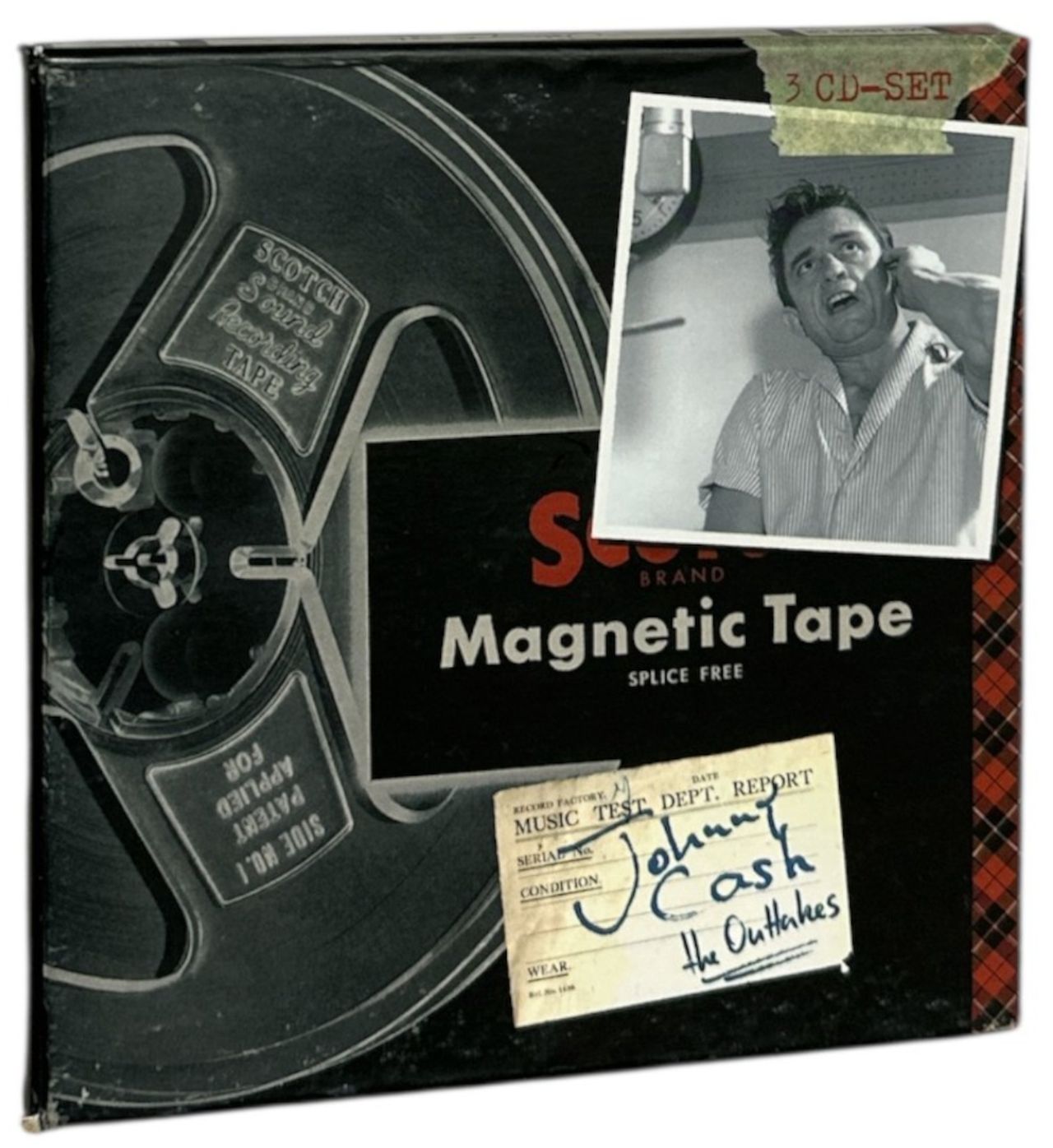 JOHNNY CASH The Outtakes (2007 German limited edition 112-track 3-CD set, offering a fascinating insight into Cash's sessions for the legendary Sun label, including alternate takes, false starts & studio chatter, all taken from the original Sun masters. Each disc in their own card wallet picture sleeve with a 100-page booklet, housed in a reel-to-reel style box. The box has some light general wear otherwise remains in a really nice condition)