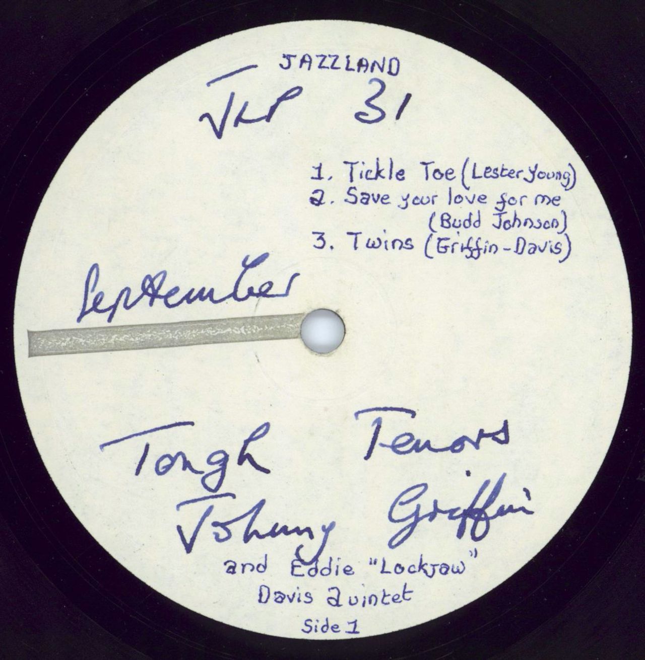 JOHNNY GRIFFIN & EDDIE 'LOCKJAW' DAVIS Tough Tenors (Rare Test Pressing for the 1960 UK 6-track LP on Jazzland, also starring Junior Mance, Larry Gales & Ben Riley. The rough textured labels are plain white & annotated with the tracklist details either side. Very few of these would have been produced this way, usually to test the sonics or send for review before release. Complete with the front laminated flipback picture sleeve, the sleeve is Excellent with just the lightest crease in the laminate & the heavyweight vinyl is clean & in Excellent condition with merely a few faint signs of play. A superb collector's copy JLP31)