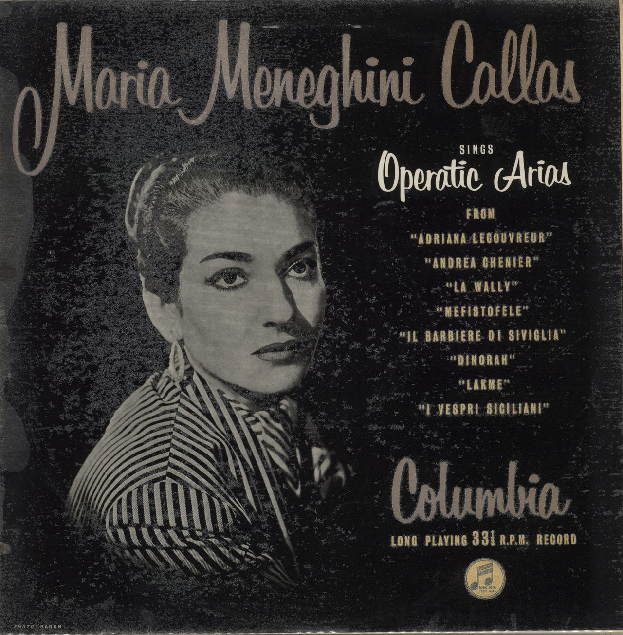 MARIA CALLAS Sings Operatic Arias (Mid-1950s UK 9-track mono vinyl LP on the 'deep groove' blue & gold Columbia label, fully laminated picture sleeve with 'scalloped' flipbacks. The sleeve shows a little discolouration & laminate lift from age. The vinyl shows little of its age with few indications of play or handling 33CX1231)