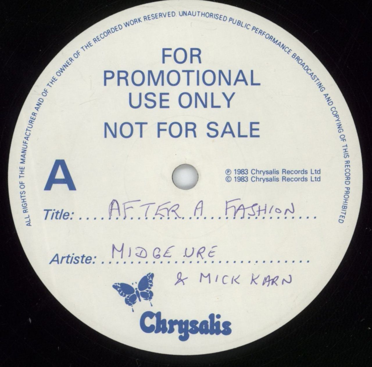 MIDGE URE & MICK KARN After A Fashion (1983 UK Chrysalis white label promotional vinyl 12", also includes Textures, custom aritst/title handwritten label in a plain die-cut card sleeve FESTX1)
