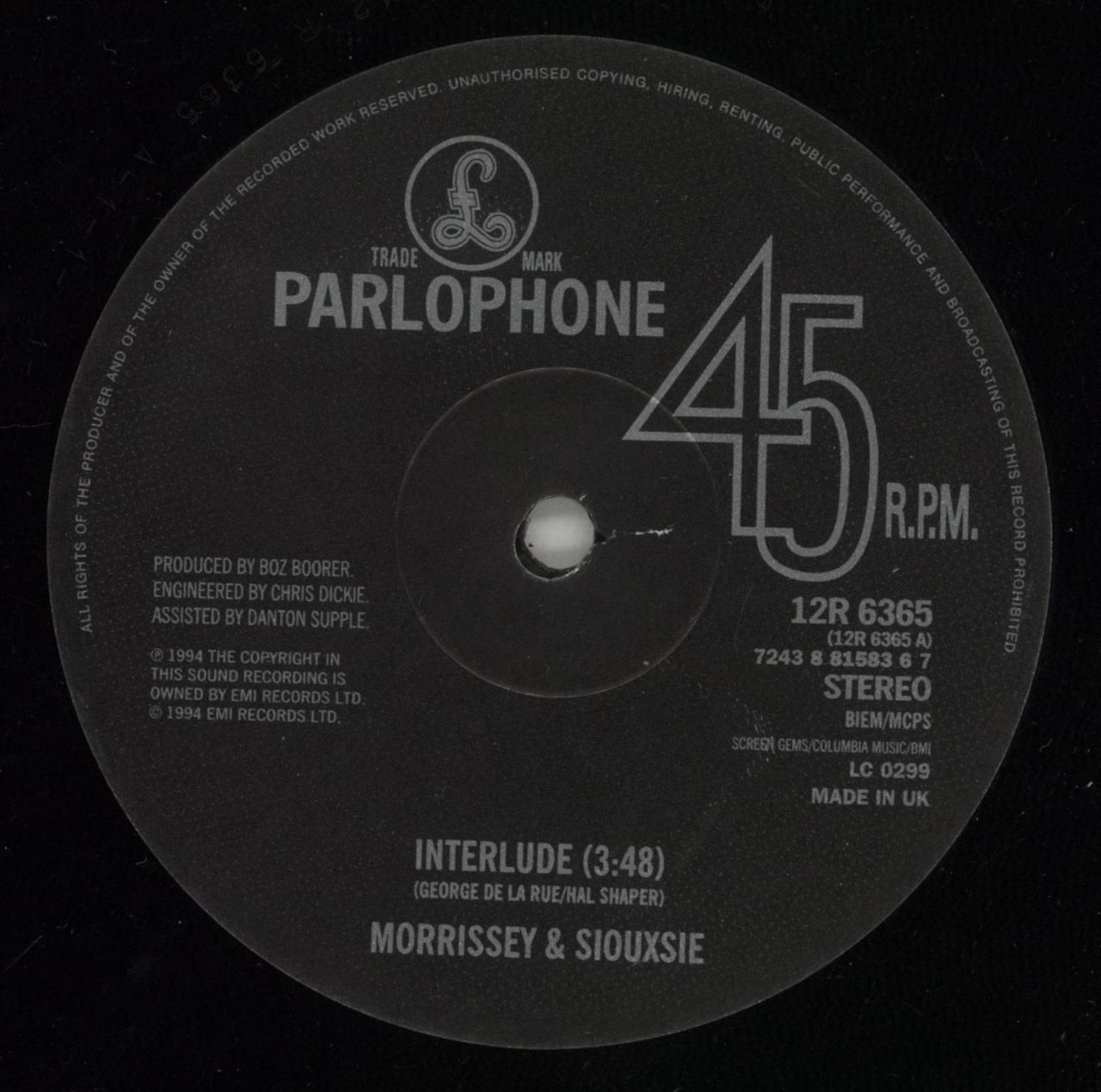 MORRISSEY Interlude - With Siouxsie (1994 UK Parlophone 3-track 12" vinyl single, also includes Extended & Instrumental Versions, picture sleeve. The sleeve has has some discolouring to the reverse and otherwise very little wear and the vinylreveals some light cosmetic scuffs from play 12R6365)