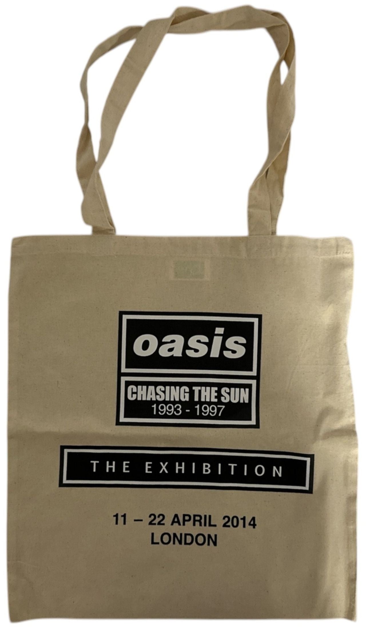OASIS Chasing The Sun 1993-1997: The Exhibition (2014 UK custom printed tote bag for the exhibition in London on the 11-22nd April 2014. The bag is custom printed with the classic logo along with details about the London exhibition all in black & white. This goody bag also includes a set of three stickers for the three huge concerts in the Summer on 1996 at Knebworth, Loch Lomond and Pairc Ui Chaolimh, along with a set of five repro cards for the shows, in a custom logo printed brown envelope!)