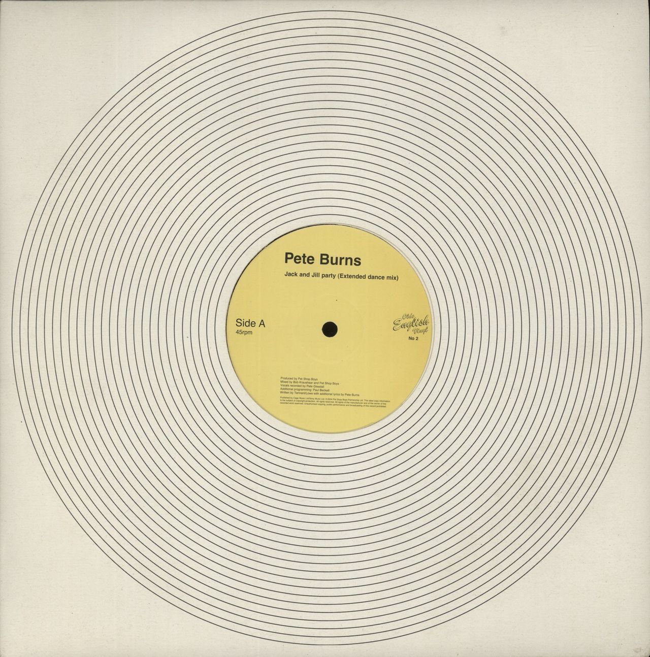 PETE BURNS Jack And Jill Party (Rare 2003 UK limited edition 3-track 12" vinyl single - written and produced by the Pet Shop Boys [available for a limited time exclusively at the official PSB website]; featuring the Extended Dance Mix,Single Mix and Instrumental. Housed in a black and white 'Olde English Vinyl' die-cut card sleeve. The sleeve has a small tear in the opening edge, but is otherwise in excellent condition and the vinyl looks barely played)