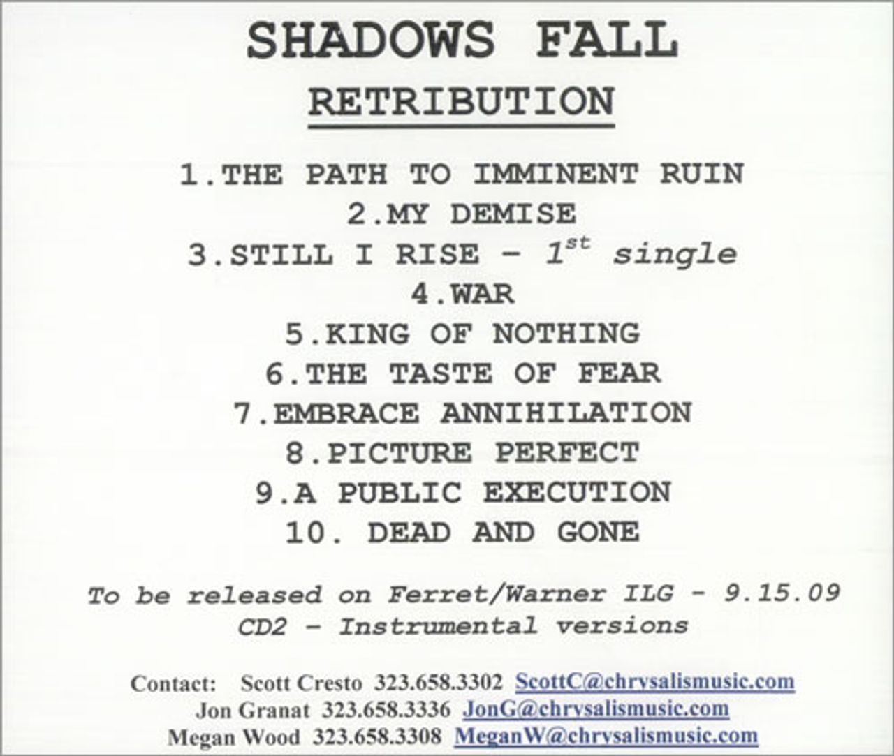 Shadows Fall Retribution US Promo CD-R acetate